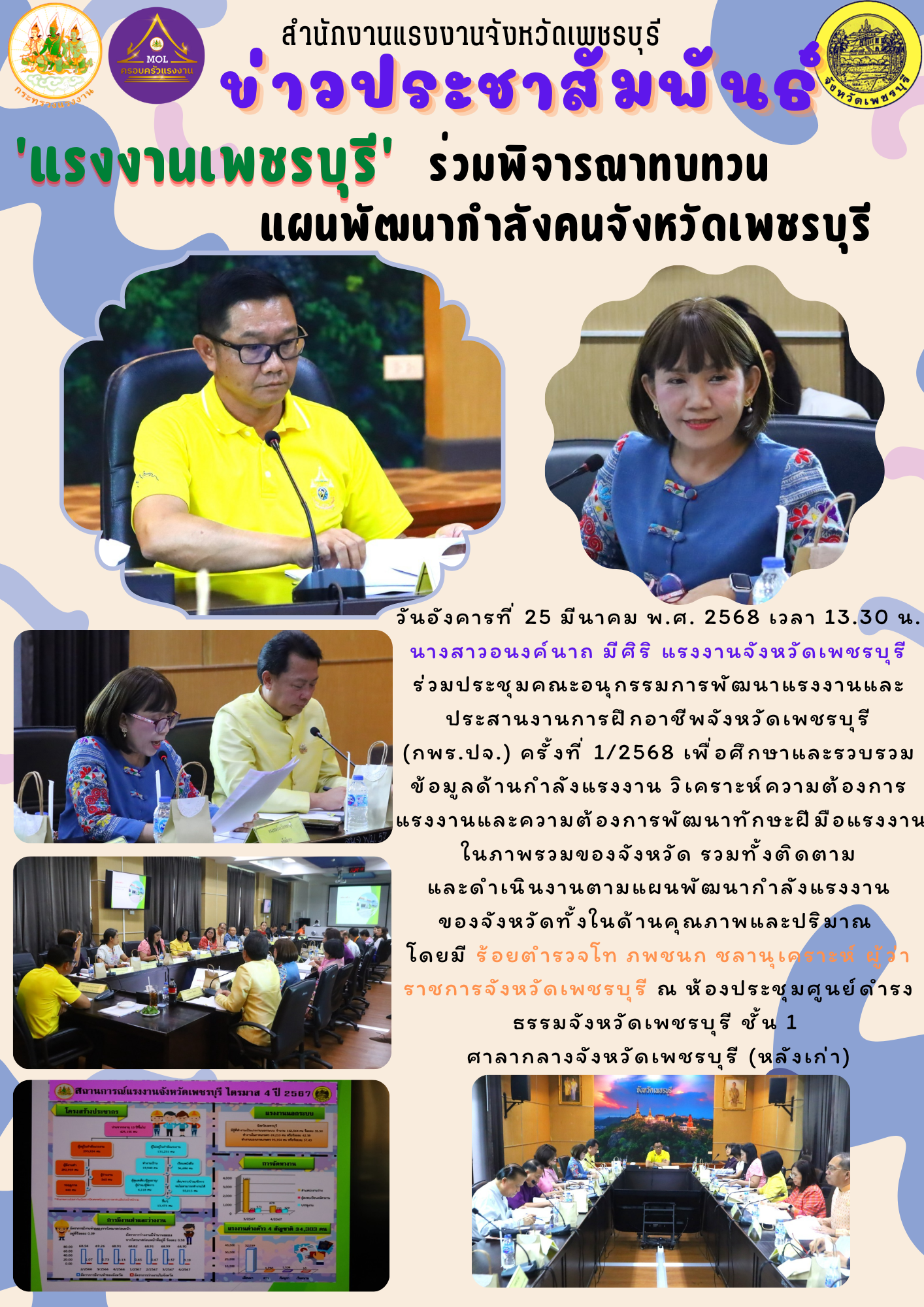 วันอังคารที่ 25 มีนาคม พ.ศ. 2568 เวลา 13.30 น. นางสาวอนงค์นาถ มีศิริ แรงงานจังหวัดเพชรบุรี ร่วมประชุมคณะอนุกรรมการพัฒนาแรงงานและประสานงานการฝึกอาชีพจังหวัดเพชรบุรี (กพร.ปจ.) ครั้งที่ 1/2568 เพื่อศึกษาและรวบรวมข้อมูลด้านกำลังแรงงาน วิเคราะห์ความต้องการแรงงานและความต้องการพัฒนาทักษะฝีมือแรงงานในภาพรวมของจังหวัด รวมทั้งติดตามและดำเนินงานตามแผนพัฒนากำลังแรงงานของจังหวัดทั้งในด้านคุณภาพและปริมาณ โดยมี ร้อยตำโท ภพชนก ชลานุเคราะห์ ผู้ว่าราชการจังหวัดเพชรบุรี ณ ห้องประชุมศูนย์ดำรงธรรมจังหวัดเพชรบุรี ชั้น 1 ศาลากลางจังหวัดเพชรบุรี (หลังเก่า)