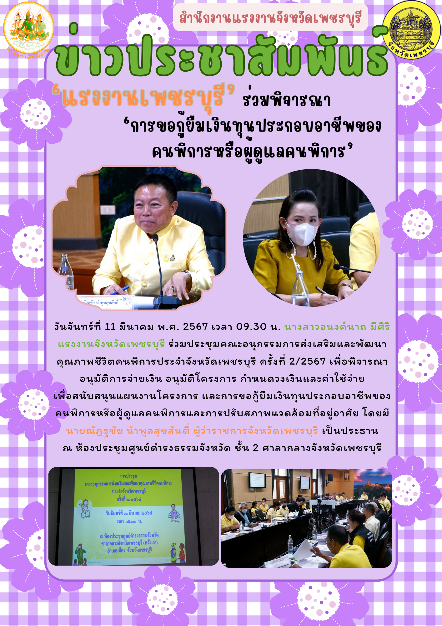 วันจันทร์ที่ 11 มีนาคม พ.ศ. 2567 เวลา 09.30 น. นางสาวอนงค์นาถ มีศิริ แรงงานจังหวัดเพชรบุรี ร่วมประชุมคณะอนุกรรมการส่งเสริมและพัฒนาคุณภาพชีวิตคนพิการประจำจังหวัดเพชรบุรี ครั้งที่ 2/2567 เพื่อพิจารณาอนุมัติการจ่ายเงิน อนุมัติโครงการ กำหนดวงเงินและค่าใช้จ่าย เพื่อสนับสนุนแผนงานโครงการ และการขอกู้ยืมเงินทุนประกอบอาชีพของคนพิการหรือผู้ดูแลคนพิการ โดยมี นายณัฏฐชัย นำพูลสุขสันติ์ ผู้ว่าราชการจังหวัดเพชรบุรี เป็นประธาน ณ ห้องประชุมศูนย์ดำรงธรรมจังหวัด ชั้น 2 ศาลากลางจังหวัดเพชรบุรี