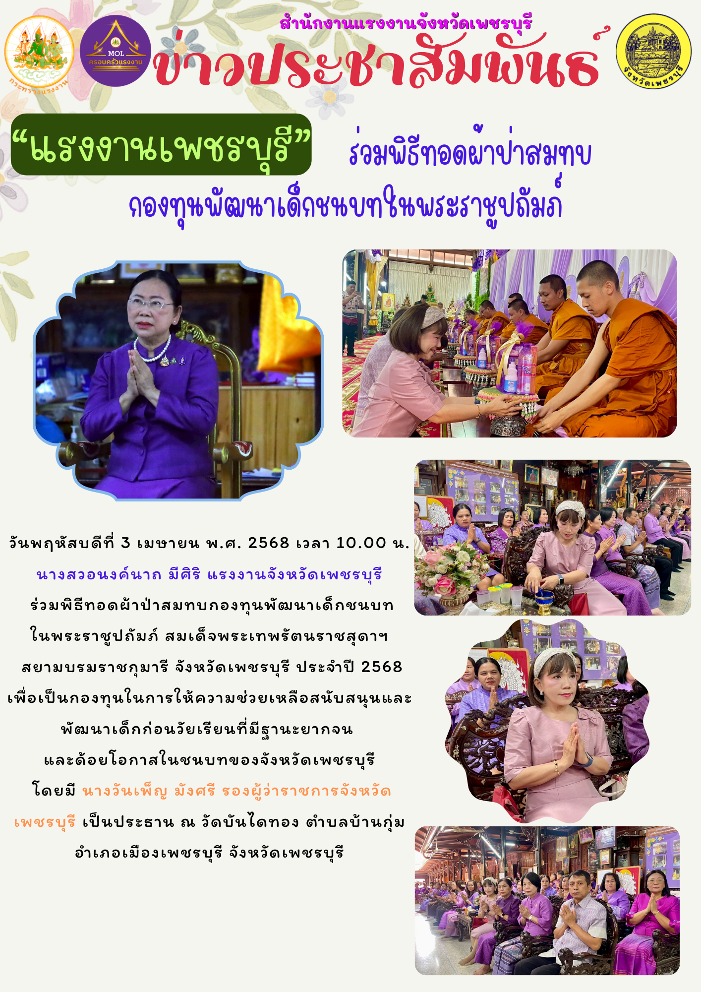 วันพฤหัสบดีที่ 3 เมษายน พ.ศ. 2568 เวลา 10.00 น. นางสวอนงค์นาถ มีศิริ แรงงานจังหวัดเพชรบุรี ร่วมพิธีทอดผ้าป่าสมทบกองทุนพัฒนาเด็กชนบทในพระราชูปถัมภ์ สมเด็จพระเทพรัตนราชสุดาฯ สยามบรมราชกุมารี จังหวัดเพชรบุรี ประจำปี 2568 เพื่อเป็นกองทุนในการให้ความช่วยเหลือสนับสนุนและพัฒนาเด็ก ก่อนวัยเรียนที่มีฐานะยากจน และด้อยโอกาสในชนบทของจังหวัดเพชรบุรี โดยมี นางวันเพ็ญ มังศรี รองผู้ว่าราชการจังหวัดเพชรบุรี เป็นประธาน ณ วัดบันไดทอง ตำบลบ้านกุ่ม อำเภอเมืองเพชรบุรี จังหวัดเพชรบุรี