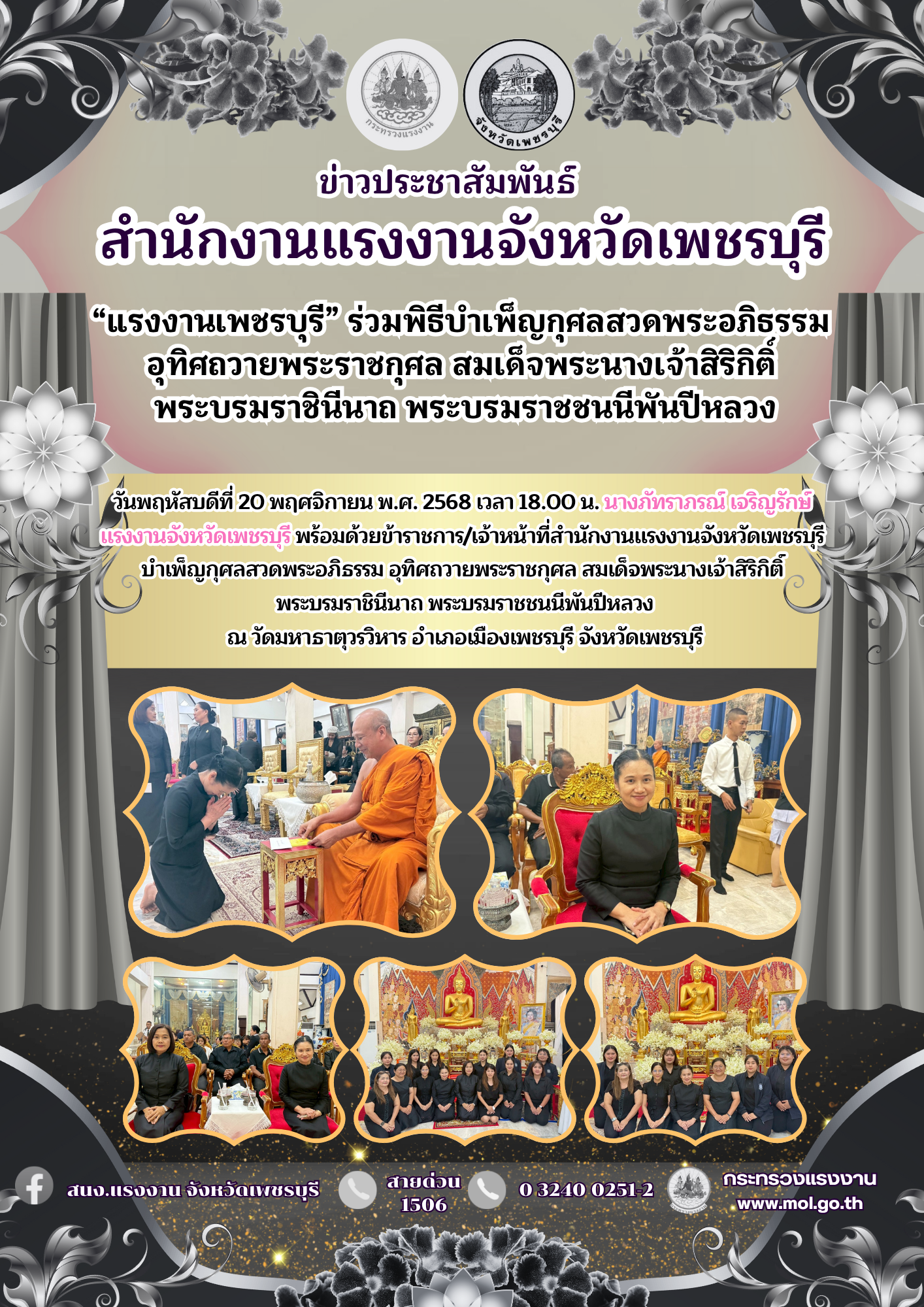 “แรงงานเพชรบุรี” ร่วมพิธีบำเพ็ญกุศลสวดพระอภิธรรม อุทิศถวายพระราชกุศล สมเด็จพระนางเจ้าสิริกิติ์ พระบรมราชินีนาถ พระบรมราชชนนีพันปีหลวง