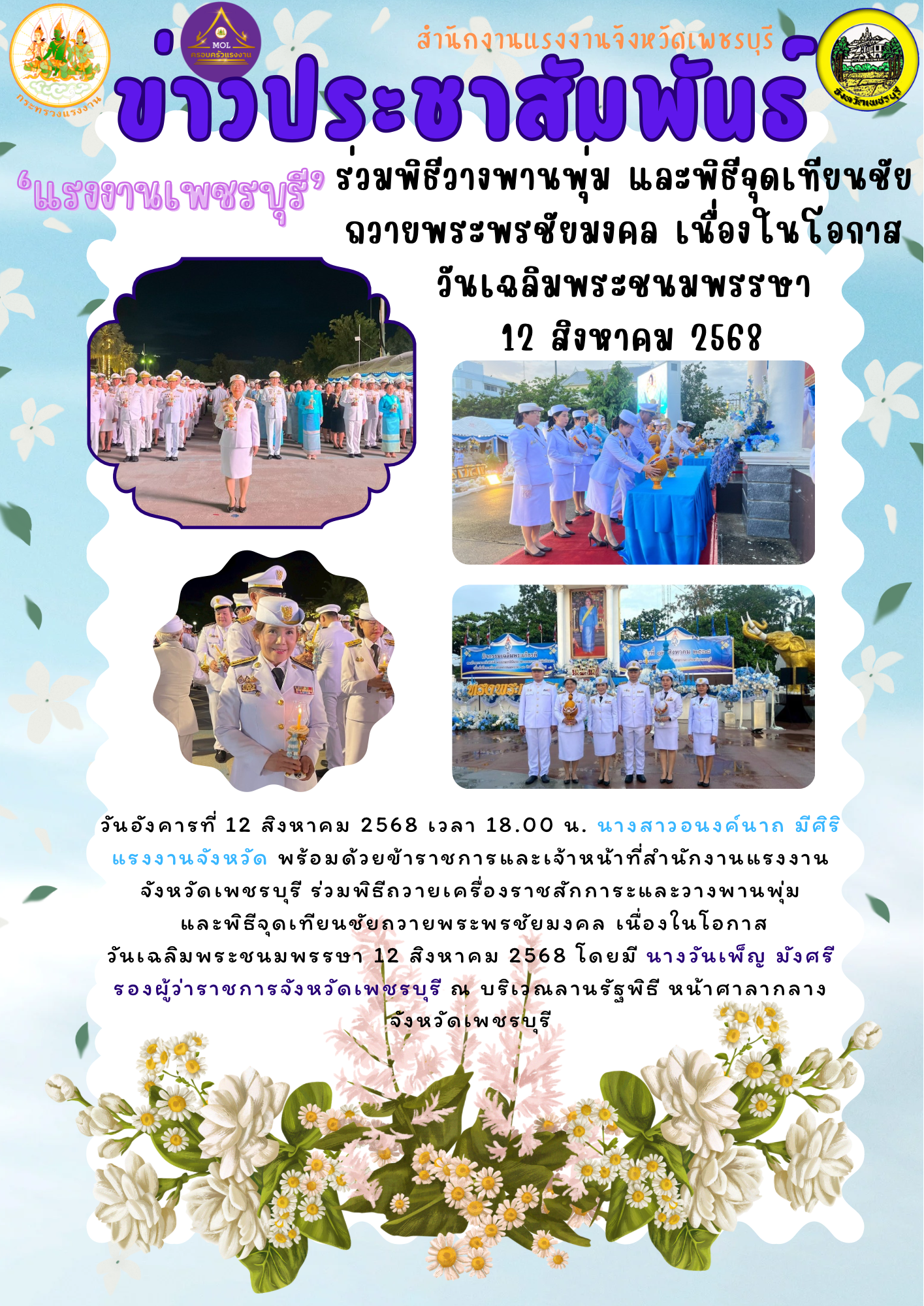 วันอังคารที่ 12 สิงหาคม 2568 เวลา 18.00 น. นางสาวอนงค์นาถ มีศิริ แรงงานจังหวัด พร้อมด้วยข้าราชการและเจ้าหน้าที่สำนักงานแรงงานจังหวัดเพชรบุรี ร่วมพิธีถวายเครื่องราชสักการะและวางพานพุ่ม และพิธีจุดเทียนชัยถวายพระพรชัยมงคล เนื่องในโอกาสวันเฉลิมพระชนมพรรษา 12 สิงหาคม 2568 โดยมี นางวันเพ็ญ มังศรี รองผู้ว่าราชการจังหวัดเพชรบุรี ณ บริเวณลานรัฐพิธี หน้าศาลากลางจังหวัดเพชรบุรี