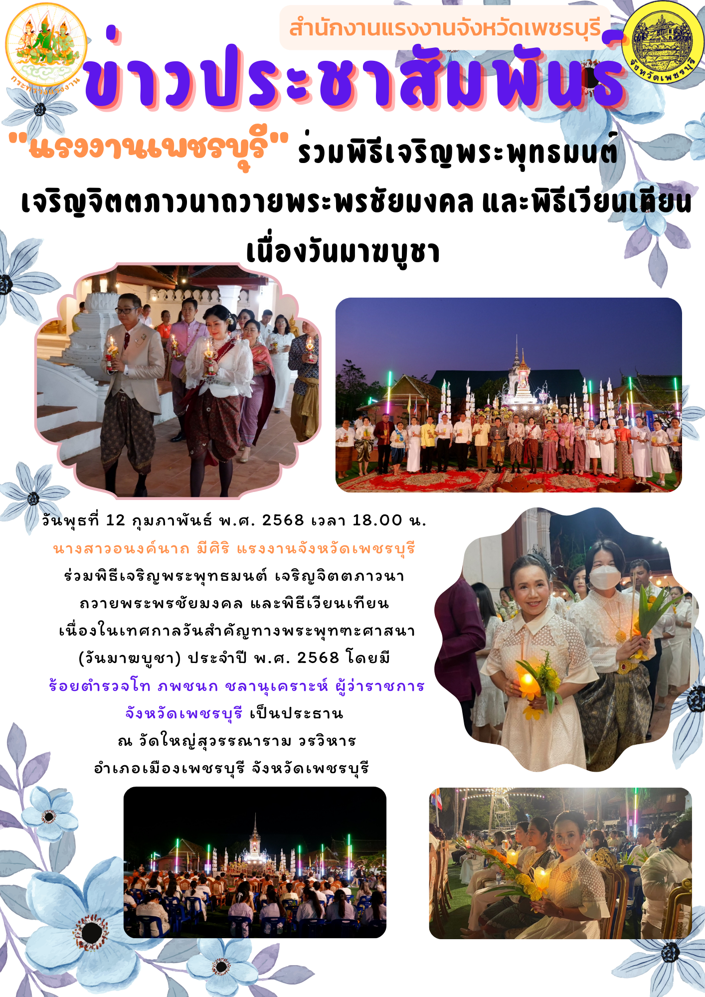 วันพุธที่ 12 กุมภาพันธ์ พ.ศ. 2568 เวลา 18.00 น. นางสาวอนงค์นาถ มีศิริ แรงงานจังหวัดเพชรบุรี ร่วมพิธีเจริญพระพุทธมนต์ เจริญจิตตภาวนาถวายพระพรชัยมงคล และพิธีเวียนเทียน เนื่องในเทศกาลวันสำคัญทางพระพุทฑะศาสนา (วันมาฆบูชา) ประจำปี พ.ศ. 2568 โดยมี ร้อยตำรวจโท ภพชนก ชลานุเคราะห์ ผู้ว่าราชการจังหวัดเพชรบุรี เป็นประธาน ณ วัดใหญ่สุวรรณาราม วรวิหารอำเภอเมืองเพชรบุรี จังหวัดเพชรบุรี