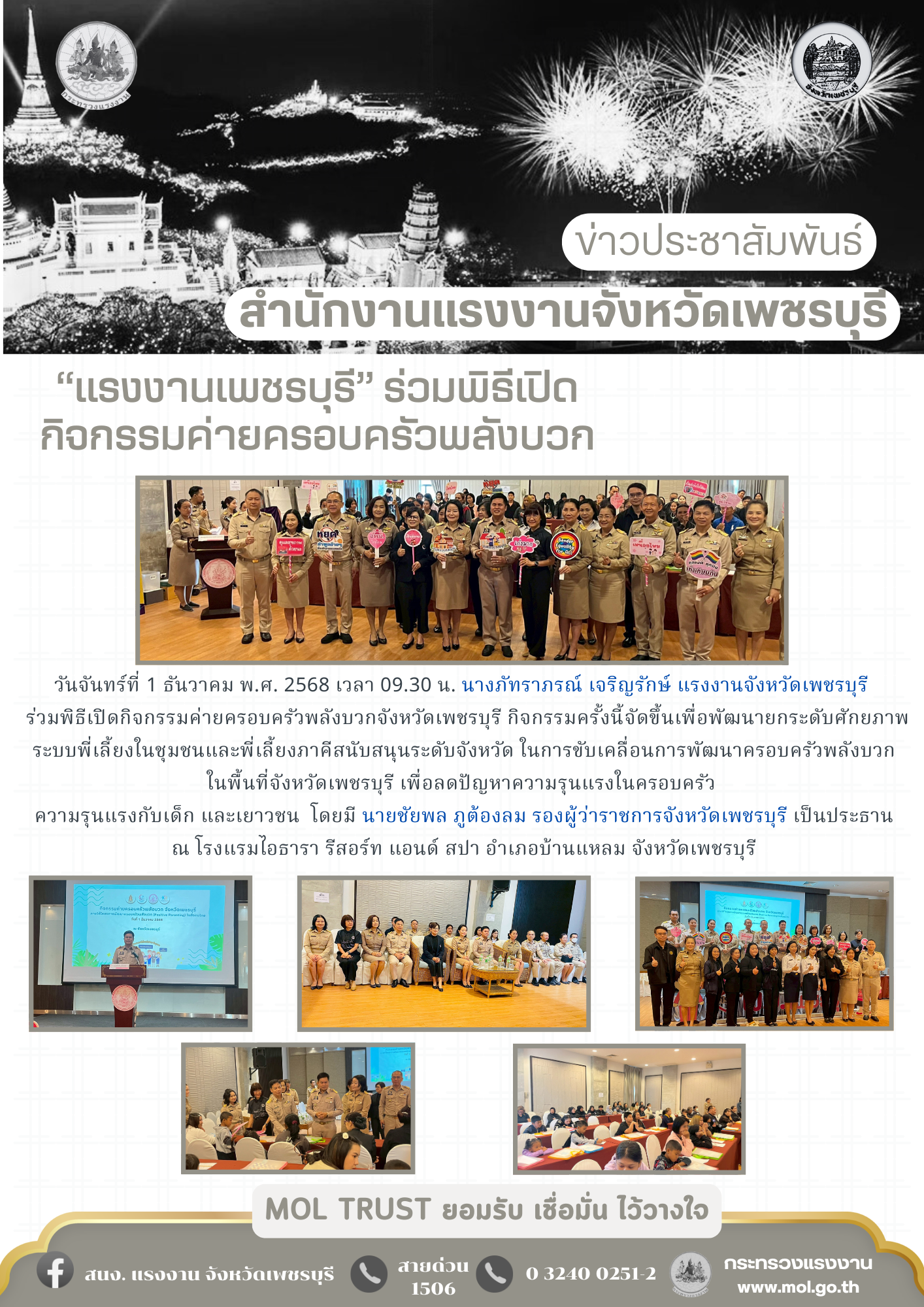 วันจันทร์ที่ 1 ธันวาคม พ.ศ. 2568 เวลา 09.30 น. นางภัทราภรณ์ เจริญรักษ์ แรงงานจังหวัดเพชรบุรี ร่วมพิธีเปิดกิจกรรมค่ายครอบครัวพลังบวกจังหวัดเพชรบุรี กิจกรรมครั้งนี้จัดขึ้นเพื่อพัฒนายกระดับศักยภาพระบบพี่เลี้ยงในชุมชนและพี่เลี้ยงภาคีสนับสนุนระดับจังหวัด ในการขับเคลื่อนการพัฒนาครอบครัวพลังบวก ในพื้นที่จังหวัดเพชรบุรี เพื่อลดปัญหาความรุนแรงในครอบครัว ความรุนแรงกับเด็ก และเยาวชน โดยมี นายชัยพล ภูต้องลม รองผู้ว่าราชการจังหวัดเพชรบุรี เป็นประธาน ณ โรงแรมไอธารา รีสอร์ท แอนด์ สปา อำเภอบ้านแหลม จังหวัดเพชรบุรี