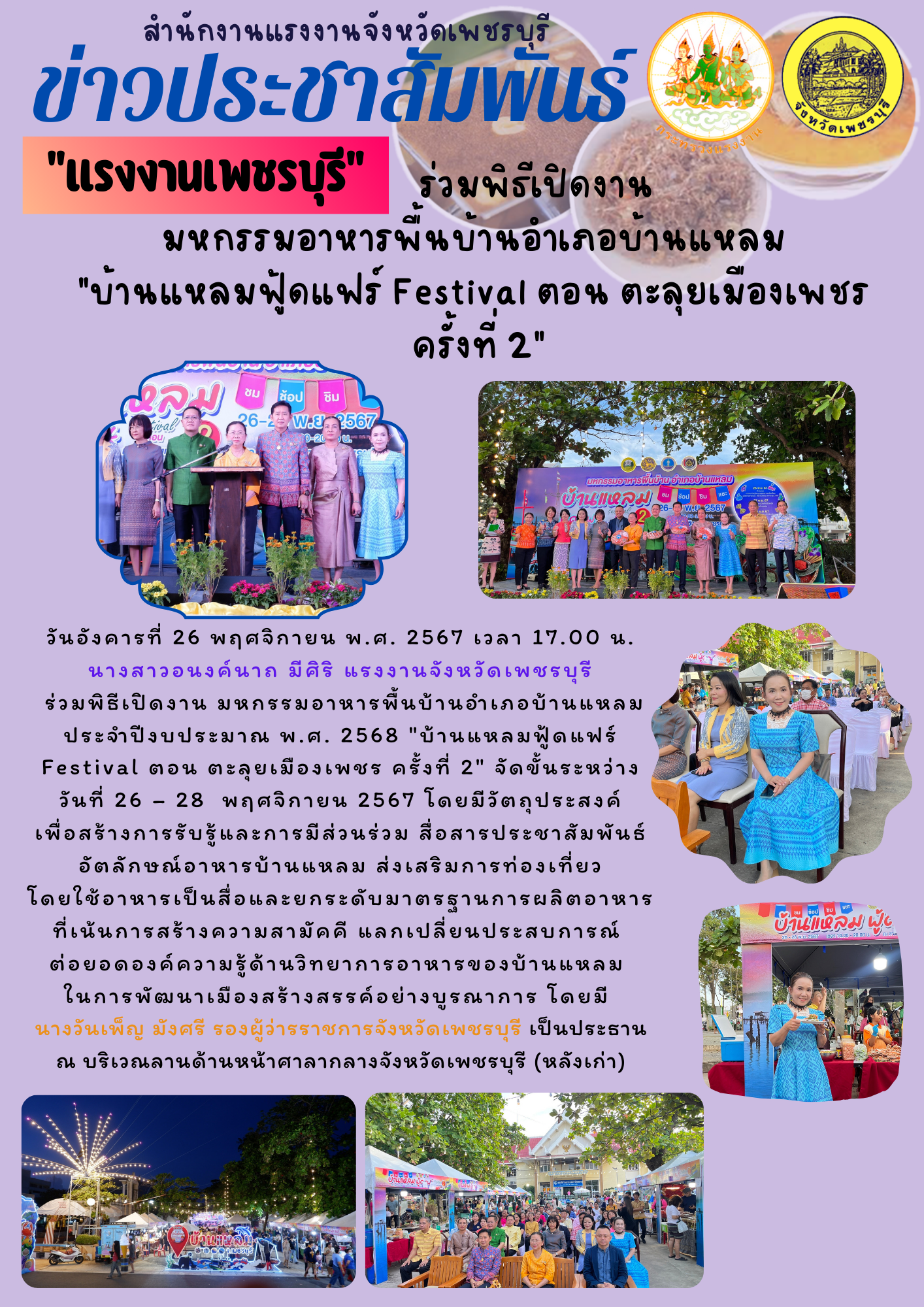 วันอังคารที่ 26 พฤศจิกายน พ.ศ. 2567 เวลา 17.00 น. นางสาวอนงต์นาถ มีศิริ แรงงานจังหวัดเพชรบุรี ร่วมพิธีเปิดงาน มหกรรมอาหารพื้นบ้านอำเภอบ้านแหลม ประจำปีงบประมาณ พ.ศ. 2568 “บ้านแหลมฟู้ดแฟร์ Festival ตอน ตะลุยเมืองเพชร ครั้งที่ 2” จัดขั้นระหว่างวันที่ 26 – 28 พฤศจิกายน 2567 โดยมีวัตถุประสงค์เพื่อสร้างการรับรู้และการมีส่วนร่วม สื่อสารประชาสัมพันธ์ อัตลักษณ์อาหารบ้านแหลม ส่งเสริมการท่องเที่ยวโดยใช้อาหารเป็นสื่อและยกระดับมาตรฐานการผลิตอาหารที่เน้นการสร้างความสามัคคี แลกเปลี่ยนประสบการณ์ ต่อยอดองค์ความรู้ด้านวิทยาการอาหารของบ้านแหลม ในการพัฒนาเมืองสร้างสรรค์อย่างบูรณาการ โดยมี นาบงวันเพ็ญ มังศรี รองผู้ว่ารราชการจังหวัดเพชรบุรี เป็นประธาน ณ บริเวณลานด้านหน้าศาลากลางจังหวัดเพชรบุรี (หลังเก่า)