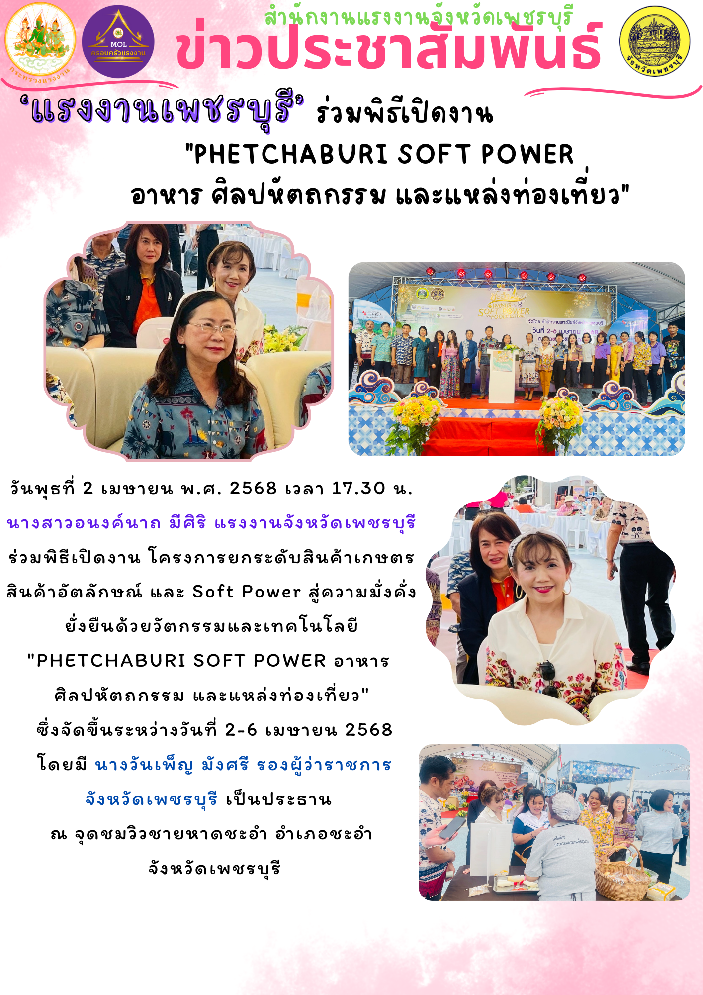 วันพุธที่ 2 เมษายน พ.ศ. 2568 เวลา 17.30 น. นางสาวอนงค์นาถ มีศิริ แรงงานจังหวัดเพชรบุรี ร่วมพิธีเปิดงาน โครงการยกระดับสินค้าเกษตร สินค้าอัตลักษณ์ และ Soft Power สู่ความมั่งคั่งยั่งยืนด้วยวัตกรรมและเทคโนโลยี “PHETCHABURI SOFT POWER อาหาร ศิลปหัตถกรรม และแหล่งท่องเที่ยว” ซึ่งจัดขึ้นระหว่างวันที่ 2-6 เมษายน 2568 โดยมี นางวันเพ็ญ มังศรี รองผู้ว่าราชการจังหวัดเพชรบุรี เป็นประธาน ณ จุดชมวิวชายหาดชะอำ อำเภอชะอำ จังหวัดเพชรบุรี