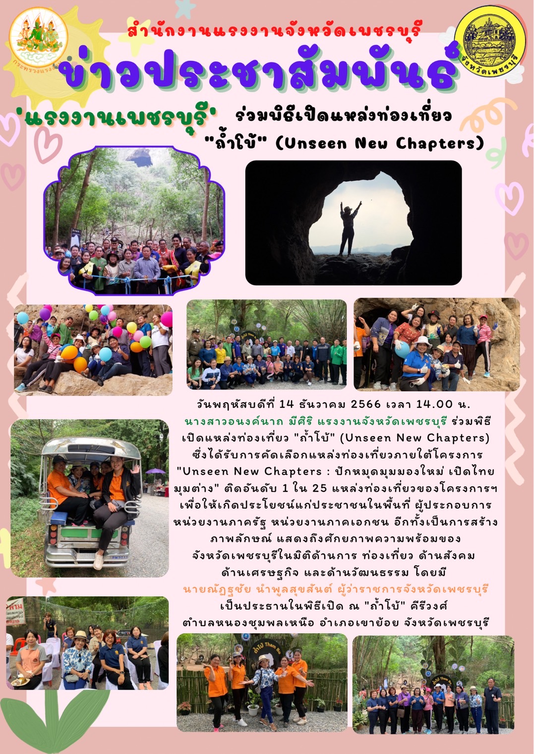 วันพฤหัสบดีที่ 14 ธันวาคม 2566 เวลา 14.00 น. นางสาวอนงค์นาถ มีศิริ แรงงานจังหวัดเพชรบุรี ร่วมพิธีเปิดแหล่งท่องเที่ยว “ถ้ำโบ้” (Unseen New Chapters) ซึ่งได้รับการคัดเลือกแหล่งท่องเที่ยวภายใต้ โครงการ “Unseen New Chapters : ปักหมุดมุมมองใหม่ เปิดไทยมุมต่าง” ติดอันดับ ๑ใน ๒๕ แหล่ง ท่องเที่ยวของโครงการฯ เพื่อให้เกิดประโยชน์แก่ประชาชนในพื้นที่ ผู้ประกอบการ หน่วยงานภาครัฐ หน่วยงานภาคเอกชน อีกทั้งเป็นการสร้างภาพลักษณ์ แสดงถึงศักยภาพความพร้อมของจังหวัดเพชรบุรีในมิติด้านการ ท่องเที่ยว ด้านสังคม ด้านเศรษฐกิจ และด้านวัฒนธรรม โดยมีนายณัฏฐชัย นำพูลสุขสันต์ ผู้ว่าราชการจังหวัดเพชรบุรี เป็นประธานในพิธีเปิด ณ “ถ้ำโบ้” คีรีวงศ์ ตำบลหนองชุมพลเหนือ อำเภอเขาย้อย จังหวัดเพชรบุรี