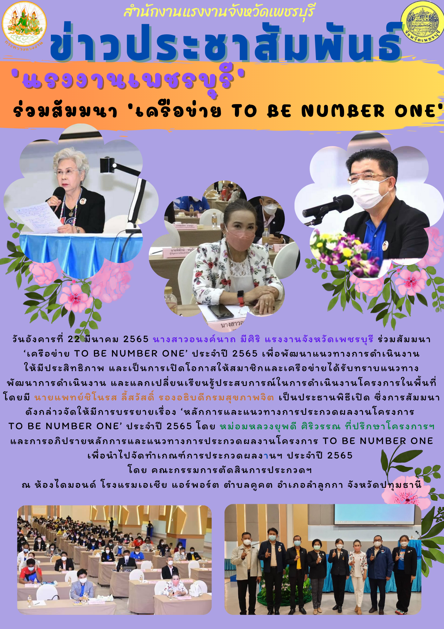 วันอังคารที่ 22 มีนาคม 2565 นางสาวอนงค์นาถ มีศิริ แรงงานจังหวัดเพชรบุรี ร่วมสัมมนา ‘เครือข่าย TO BE NUMBER ONE’ ประจำปี 2565 เพื่อพัฒนาแนวทางการดำเนินงานให้มีประสิทธิภาพ และเป็นการเปิดโอกาสให้สมาชิกและเครือข่ายได้รับทราบแนวทางพัฒนาการดำเนินงาน และแลกเปลี่ยนเรียนรู้ประสบการณ์ในการดำเนินงานโครงการในพื้นที่ โดยมี นายแพทย์ชิโนรส ลี้สวัสดิ์ รองอธิบดีกรมสุขภาพจิต เป็นประธานพิธีเปิด ซึ่งการสัมมนาดังกล่าวจัดให้มีการบรรยายเรื่อง ‘หลักการและแนวทางการประกวดผลงานโครงการ TO BE NUMBER ONE’ ประจำปี 2565 โดย หม่อมหลวงยุพดี ศิริวรรณ ที่ปรึกษาโครงการฯ และการอภิปรายหลักการและแนวทางการประกวดผลงานโครงการ TO BE NUMBER ONE เพื่อนำไปจัดทำเกณฑ์การประกวดผลงานฯ ประจำปี 2565 โดย คณะกรรมการตัดสินการประกวดฯ ณ ห้องไดมอนด์ โรงแรมเอเชีย แอร์พอร์ต ตำบลคูคต อำเภอลำลูกกา จังหวัดปทุมธานี