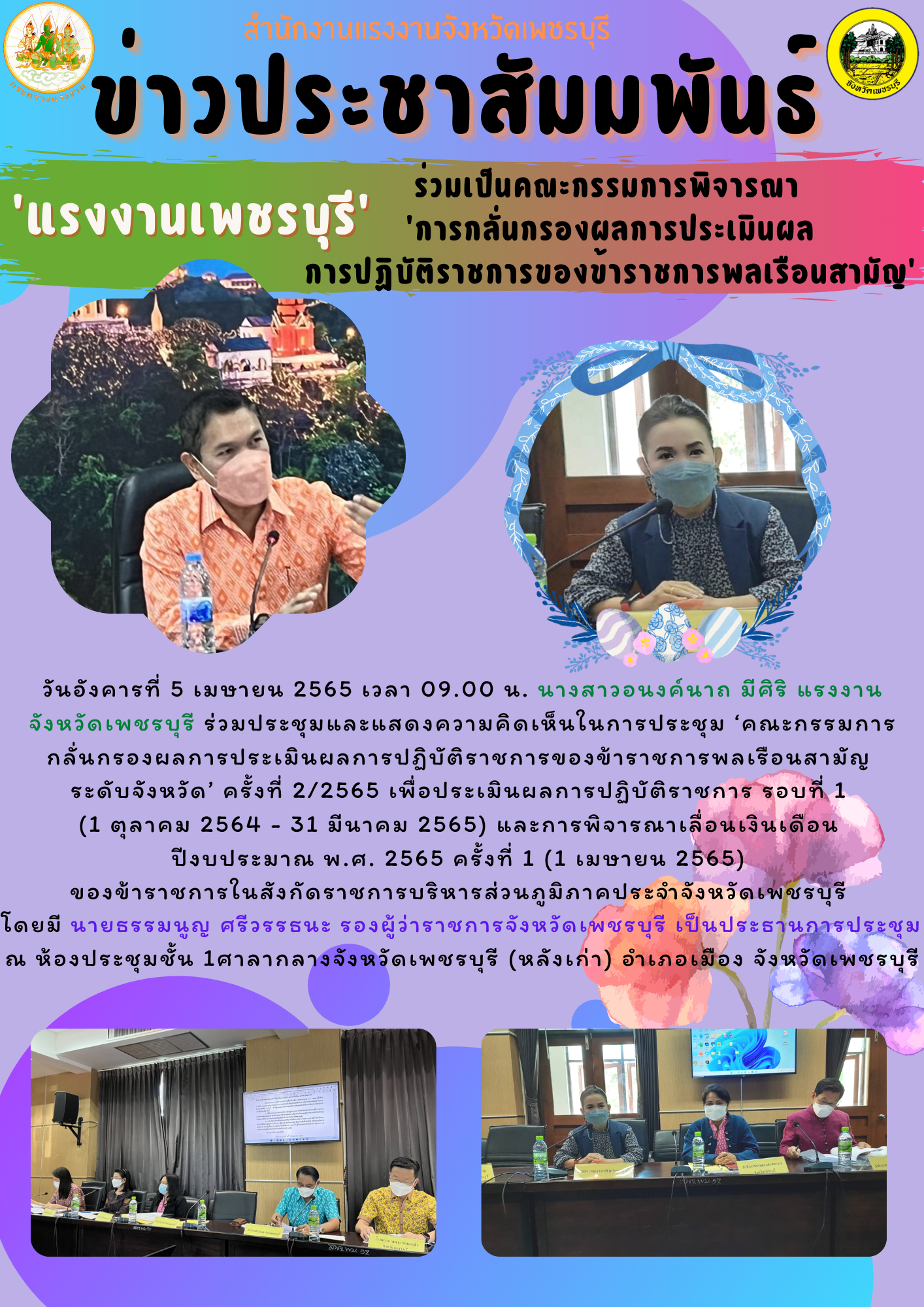 วันอังคารที่ 5 เมษายน 2565 เวลา 09.00 น. นางสาวอนงค์นาถ มีศิริ แรงงานจังหวัดเพชรบุรี ร่วมประชุมและแสดงความคิดเห็นในการประชุม ‘คณะกรรมการกลั่นกรองผลการประเมินผลการปฏิบัติราชการของข้าราชการพลเรือนสามัญ ระดับจังหวัด’ ครั้งที่ 2/2565 เพื่อประเมินผลการปฏิบัติราชการ รอบที่ 1 (1 ตุลาคม 2564 – 31 มีนาคม 2565) และการพิจารณาเลื่อนเงินเดือน ปีงบประมาณ พ.ศ. 2565 ครั้งที่ 1 (1 เมษายน 2565) ของข้าราชการในสังกัดราชการบริหารส่วนภูมิภาคประจำจังหวัดเพชรบุรี โดยมี นายธรรมนูญ ศรีวรรธนะ รองผู้ว่าราชการจังหวัดเพชรบุรี เป็นประธานการประชุม ณ ห้องประชุมชั้น 1 ศาลากลางจังหวัดเพชรบุรี (หลังเก่า) อำเภอเมือง จังหวัดเพชรบุรี
