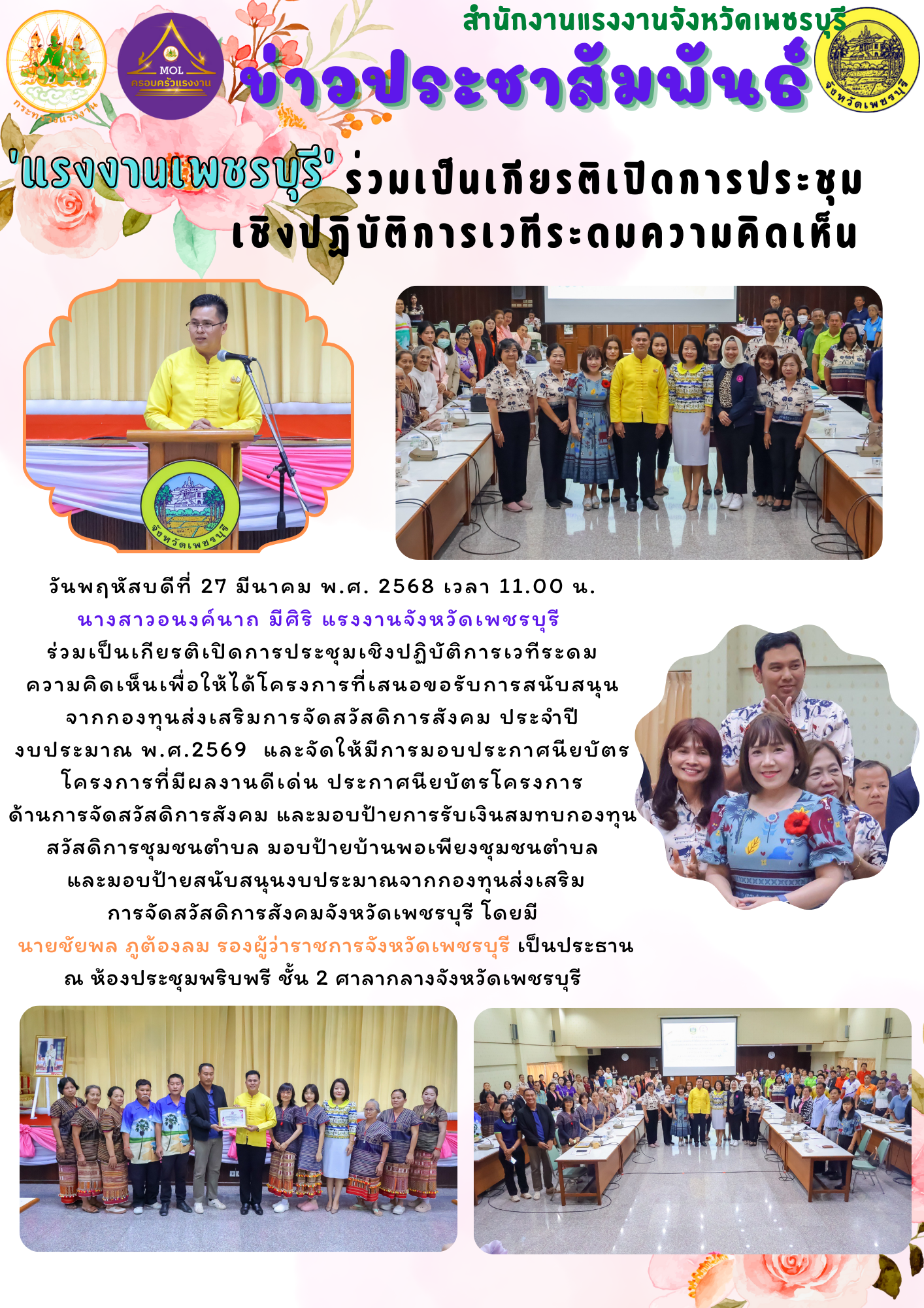 วันพฤหัสบดีที่ 27 มีนาคม พ.ศ. 2568 เวลา 11.00 น. นางสาวอนงค์นาถ มีศิริ แรงงานจังหวัดเพชรบุรี ร่วมเป็นเกียรติเปิดการประชุมเชิงปฏิบัติการเวทีระดมความคิดเห็นเพื่อให้ได้โครงการที่เสนอขอรับการสนับสนุนจากกองทุนส่งเสริมการจัดสวัสดิการสังคม ประจำปีงบประมาณ พ.ศ.2569 ให้แก่ ผู้แทนจากองค์กรสาธารณประโยชน์ และผู้แทนจากองค์กรสวัสดิการชุมชน และจัดให้มีการมอบประกาศนียบัตรโครงการที่มีผลงานดีเด่น ประกาศนียบัตรโครงการด้านการจัดสวัสดิการสังคม และมอบป้ายการรับเงินสมทบกองทุนสวัสดิการชุมชนตำบล มอบป้ายบ้านพอเพียงชุมชนตำบล และมอบป้ายสนับสนุนงบประมาณจากกองทุนส่งเสริมการจัดสวัสดิการสังคมจังหวัดเพชรบุรี โดยมี นายชัยพล ภูต้องลม รองผู้ว่าราชการจังหวัดเพชรบุรี เป็นประธาน ณ ห้องประชุมพริบพรี ชั้น 2 ศาลากลางจังหวัดเพชรบุรี
