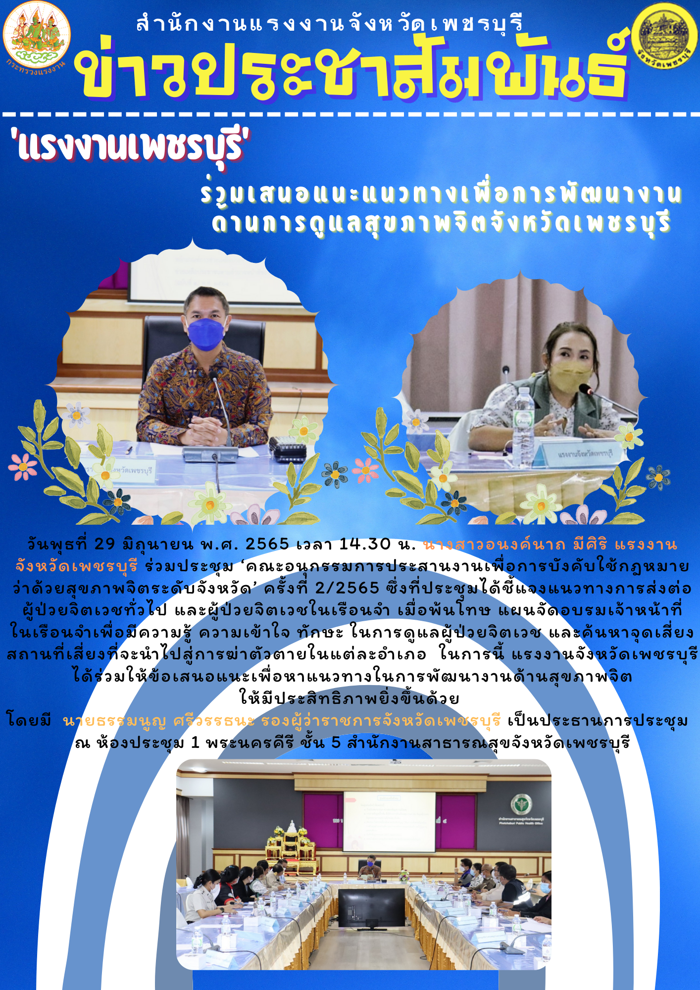 วันพุธที่ 29 มิถุนายน พ.ศ. 2565 เวลา 14.30 น. นางสาวอนงค์นาถ มีศิริ แรงงานจังหวัดเพชรบุรี ร่วมประชุม ‘คณะอนุกรรมการประสานงานเพื่อการบังคับใช้กฎหมายว่าด้วยสุขภาพจิตระดับจังหวัด’ ครั้งที่ 2/2565 ซึ่งที่ประชุมได้ชี้แจงแนวทางการส่งต่อผู้ป่วยจิตเวชทั่วไป และผู้ป่วยจิตเวชในเรือนจำ เมื่อพ้นโทษ แผนจัดอบรมเจ้าหน้าที่ในเรือนจำเพื่อมีความรู้ ความเข้าใจ ทักษะ ในการดูแลผู้ป่วยจิตเวช และค้นหาจุดเสี่ยง สถานที่เสี่ยงที่จะนำไปสู่การฆ่าตัวตายในแต่ละอำเภอ ในการนี้ แรงงานจังหวัดเพชรบุรี ได้ร่วมให้ข้อเสนอแนะเพื่อหาแนวทางในการพัฒนางานด้านสุขภาพจิตให้มีประสิทธิภาพยิ่งขึ้นด้วย โดยมี นายธรรมนูญ ศรีวรรธนะ รองผู้ว่าราชการจังหวัดเพชรบุรี เป็นประธานการประชุม ณ ห้องประชุม 1 พระนครคีรี ชั้น 5 สำนักงานสาธารณสุขจังหวัดเพชรบุรี