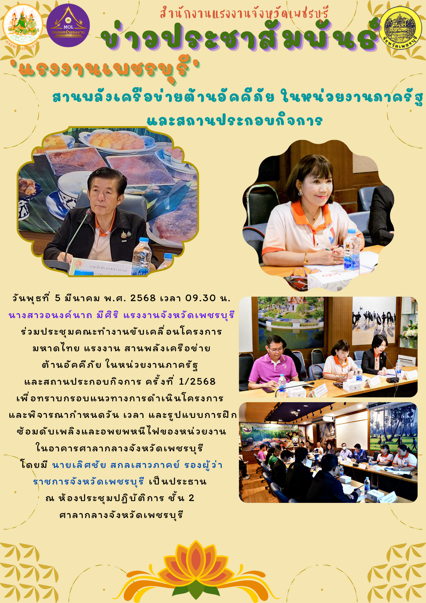วันพุธที่ 5 มีนาคม พ.ศ. 2568 เวลา 09.30 น. นางสาวอนงค์นาถ มีศิริ แรงงานจังหวัดเพชรบุรี ร่วมประชุมคณะทำงานขับเคลื่อนโครงการมหาดไทย แรงงาน สานพลังเครือข่ายต้านอัคคีภัย ในหน่วยงานภาครัฐ และสถานประกอบกิจการ ครั้งที่ 1/2568 เพื่อทราบกรอบแนวทางการดำเนินโครงการ และพิจารณากำหนดวัน เวลา และรูปแบบการฝึกซ้อมดับเพลิงและอพยพหนีไฟของหน่วยงานในอาคารศาลากลางจังหวัดเพชรบุรี โดยมี นายเลิศชัย สกลเสาวภาคย์ รองผู้ว่าราชการจังหวัดเพชรบุรี เป็นประธาน ณ ห้องประชุมปฏิบัติการ ชั้น 2 ศาลากลางจังหวัดเพชรบุรี