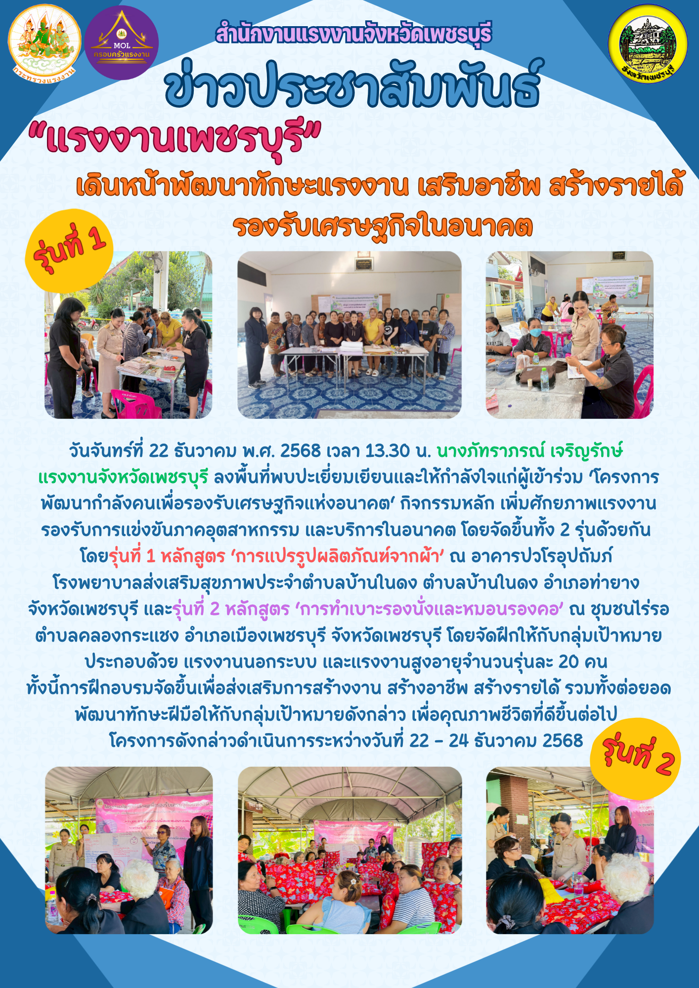 วันจันทร์ที่ 22 ธันวาคม พ.ศ. 2568 เวลา 13.30 น. นางภัทราภรณ์ เจริญรักษ์ แรงงานจังหวัดเพชรบุรี ลงพื้นที่พบปะเยี่ยมเยียนและให้กำลังใจแก่ผู้เข้าร่วม ‘โครงการพัฒนากำลังคนเพื่อรองรับเศรษฐกิจแห่งอนาคต‘ กิจกรรมหลัก เพิ่มศักยภาพแรงงานรองรับการแข่งขันภาคอุตสาหกรรม และบริการในอนาคต โดยจัดขึ้นทั้ง 2 รุ่นด้วยกัน โดยรุ่นที่ 1 หลักสูตร ‘การแปรรูปผลิตภัณฑ์จากผ้า’ ณ อาคารปวโรอุปถัมภ์โรงพยาบาลส่งเสริมสุขภาพประจำตำบลบ้านในดง ตำบลบ้านในดง อำเภอท่ายาง จังหวัดเพชรบุรี และรุ่นที่ 2 หลักสูตร ‘การทำเบาะรองนั่งและหมอนรองคอ’ ณ ชุมชนไร่รอ ตำบลคลองกระแชง อำเภอเมืองเพชรบุรี จังหวัดเพชรบุรี โดยจัดฝึกให้กับกลุ่มเป้าหมายประกอบด้วย แรงงานนอกระบบ และแรงงานสูงอายุจำนวนรุ่นละ 20 คน