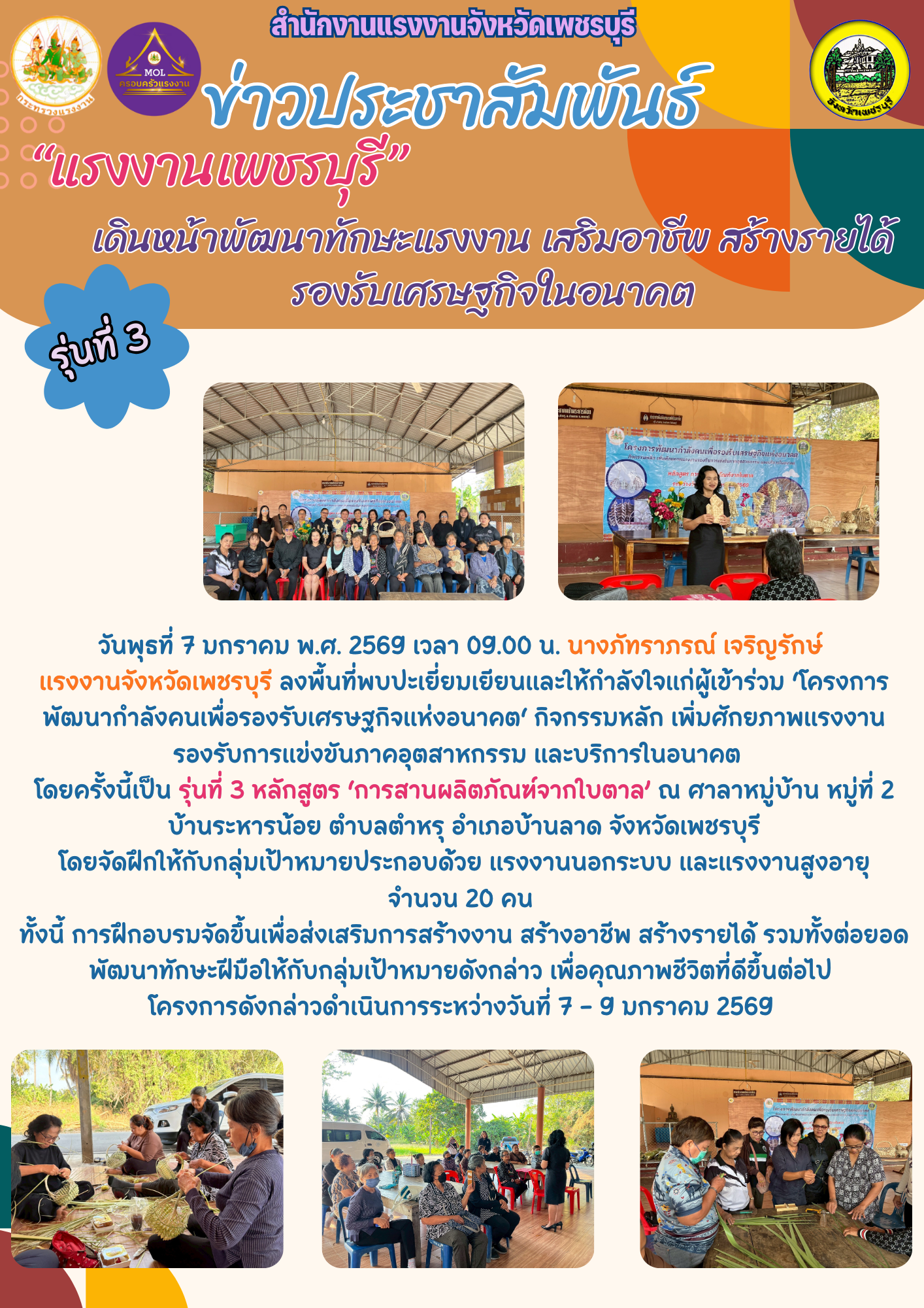 โดยครั้งนี้เป็น รุ่นที่ 3 หลักสูตร ‘การสานผลิตภัณฑ์จากใบตาล’ ณ ศาลาหมู่บ้าน หมู่ที่ 2 บ้านระหารน้อย ตำบลตำหรุ อำเภอบ้านลาด จังหวัดเพชรบุรี