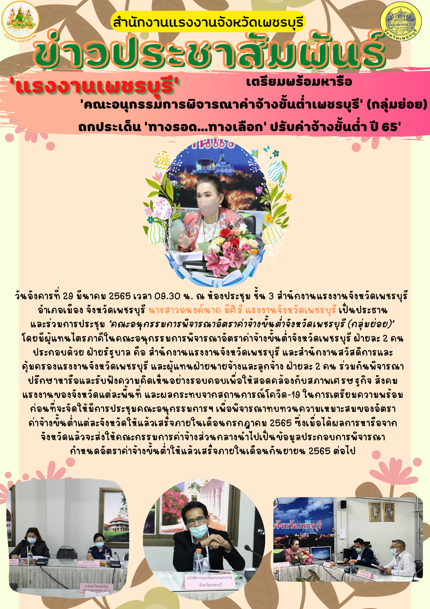 วันอังคารที่ 29 มีนาคม 2565 เวลา 09.30 น. ณ ห้องประชุม ชั้น 3 สำนักงานแรงงานจังหวัดเพชรบุรี อำเภอเมือง จังหวัดเพชรบุรี นางสาวอนงค์นาถ มีศิริ แรงงานจังหวัดเพชรบุรี เป็นประธานและร่วมการประชุม ‘คณะอนุกรรมการพิจารณาอัตราค่าจ้างขั้นต่ำจังหวัดเพชรบุรี (กลุ่มย่อย)’ โดยมีผู้แทนไตรภาคีในคณะอนุกรรมการพิจารณาอัตราค่าจ้างขั้นต่ำจังหวัดเพชรบุรี ฝ่ายละ 2 คน ประกอบด้วย ฝ่ายรัฐบาล คือ สำนักงานแรงงานจังหวัดเพชรบุรี และสำนักงานสวัสดิการและคุ้มครองแรงงานจังหวัดเพชรบุรี และผู้แทนฝ่ายนายจ้างและลูกจ้าง ฝ่ายละ 2 คน ร่วมกันพิจารณา ปรึกษาหารือและรับฟังความคิดเห็นอย่างรอบคอบเพื่อให้สอดคล้องกับสภาพเศรษฐกิจ สังคม แรงงานของจังหวัดแต่ละพื้นที่ และผลกระทบจากสถานการณ์ โควิด-19 ในการเตรียมความพร้อมก่อนที่จะจัดให้มีการประชุมคณะอนุกรรมการฯ เพื่อพิจารณาทบทวนความเหมาะสมของอัตราค่าจ้างขั้นต่ำแต่ละจังหวัดให้แล้วเสร็จภายในเดือนกรกฎาคม 2565 ซึ่งเมื่อได้ผลการหารือจากจังหวัดแล้วจะส่งให้คณะกรรมการค่าจ้างส่วนกลางนำไปเป็นข้อมูลประกอบการพิจารณากำหนดอัตราค่าจ้างขั้นต่ำให้แล้วเสร็จภายในเดือนกันยายน 2565 ต่อไป