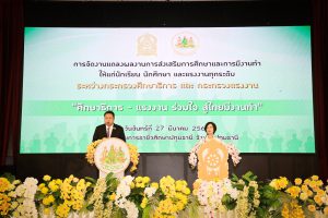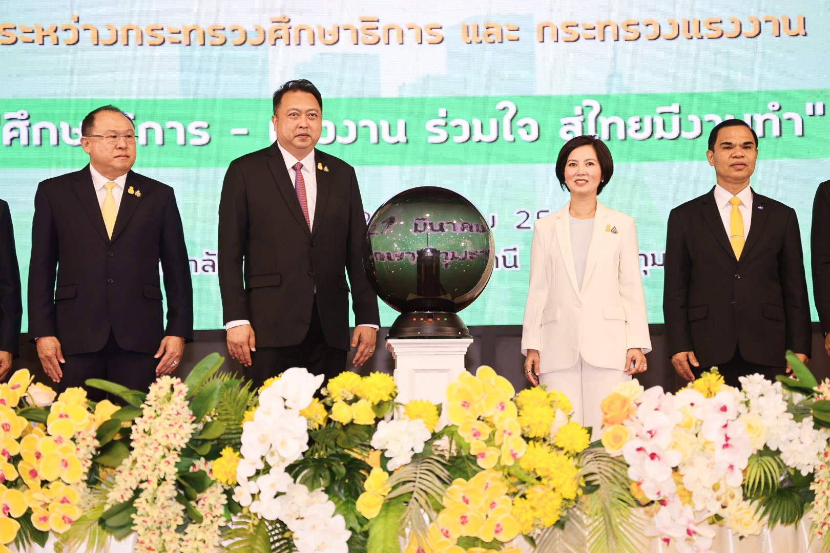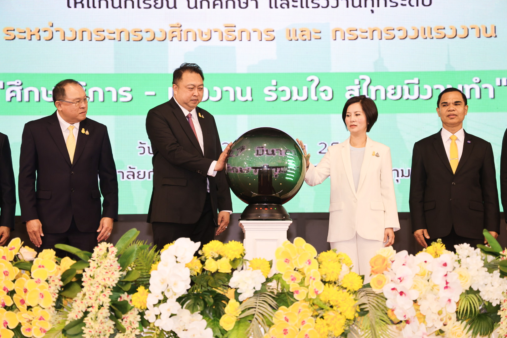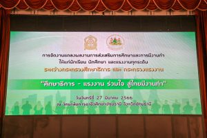 On March 27, 2023, the Labour Minister, Mr. Suchart Chomklin, presided over the announcement of the outcomes on promoting education and employment for students and workers at all levels between the Ministry of Education and the Ministry of Labour at the event “Education – Labour Joining the Heart for Thailand to have Jobs.” The Minister of Education, Ms. Treenuch Thienthong, joined the announcement. The Ministry of Education, school administrators, students, student establishments, and heads of government agencies under the Ministry of Labour in Pathum Thani Province joined to welcome them at the Pathum Thani Vocational College, Bang Phut Subdistrict, Mueang Pathum Thani District, Pathum Thani Province.