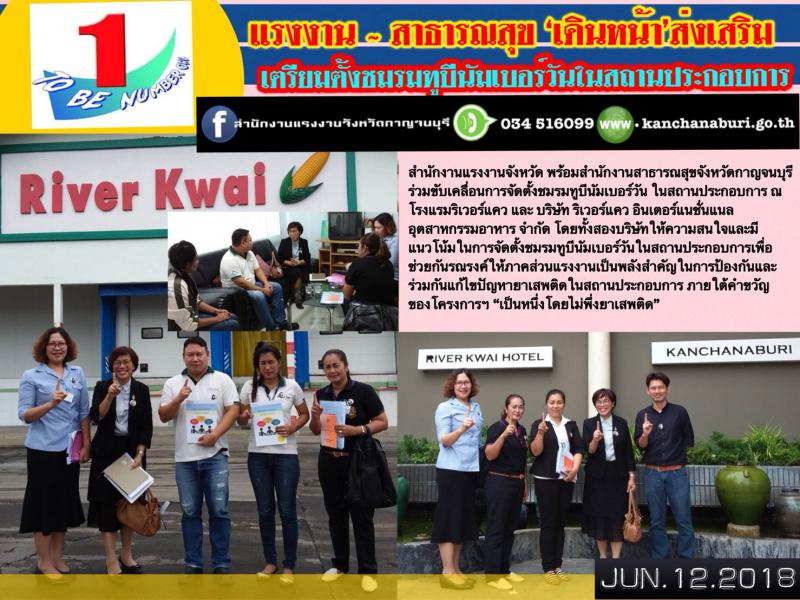 สำนักงานแรงงานจังหวัด พร้อมสำนักงานสาธารณสุขจังหวัดกาญจนบุรี ร่วมขับเคลื่อนการจัดตั้งชมรมทูบีนัมเบอร์วันในสถานประกอบการ ณ โรงแรมริเวอร์แควและบริษัทริเวอร์แคว อินเตอร์เนชั่นแนลอุตสาหกรรมอาหาร จำกัด โดยทั้งสองบริษัทให้ความสนใจและมีแนวโน้มในการจัดตั้งชมรมทูบีนัมเบอร์วันในสถานประกอบการเพื่อช่วยกันรณรงค์ให้ภาคส่วนแรงงานเป็นพลังสำคัญ ในการป้องกันและร่วมกันแก้ไขปัญหายาเสพติดในสถานประกอบการภายใต้คำขวัญของโครงการฯ "เป็นหนึ่งโดยไม่พึ่งยาเสพติด"