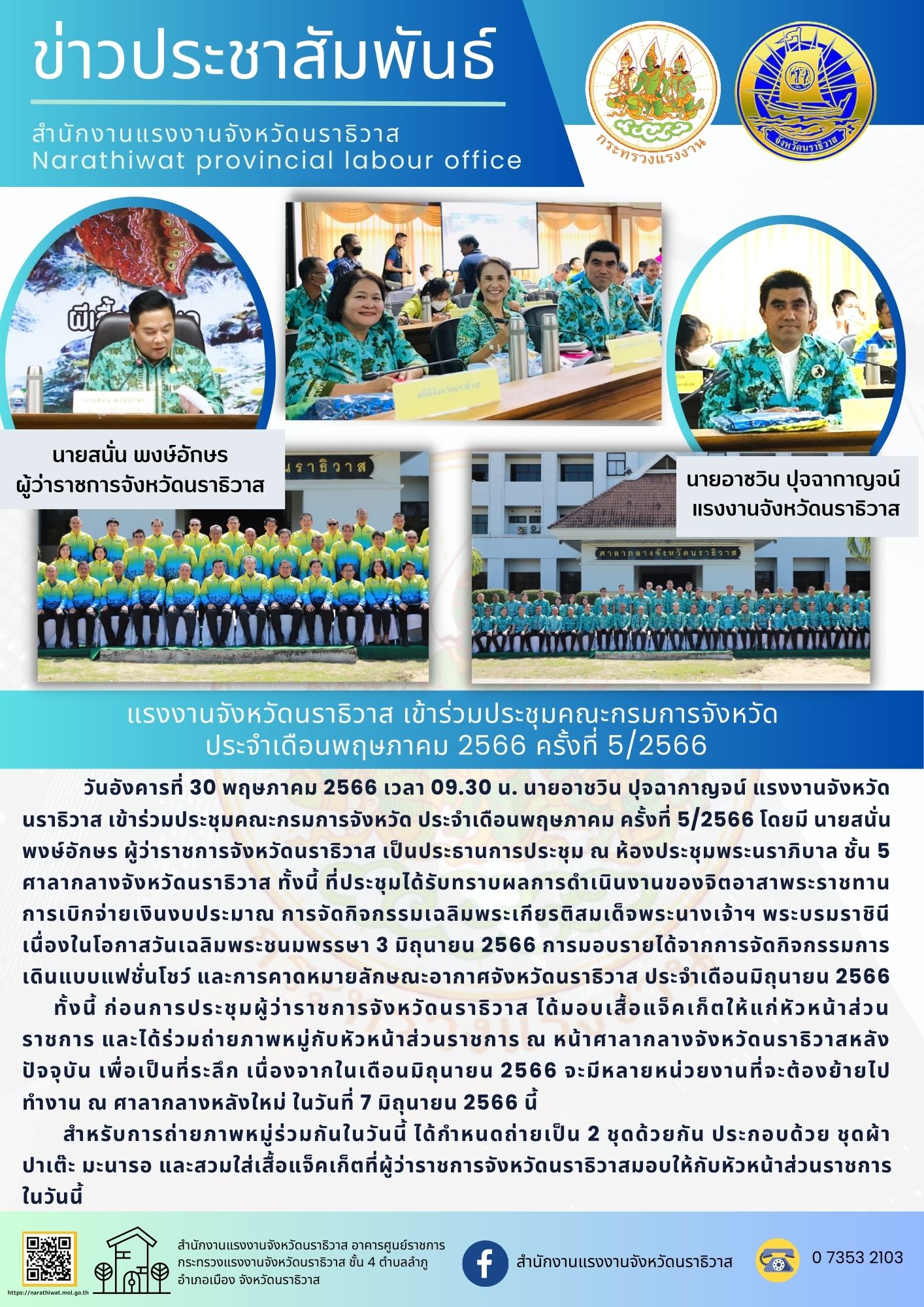 วันอังคารที่ 30 พฤษภาคม 2566 เวลา 09.30 น. นายอาชวิน ปุจฉากาญจน์ แรงงานจังหวัดนราธิวาส เข้าร่วมประชุมคณะกรมการจังหวัด ประจำเดือนพฤษภาคม ครั้งที่ 5/2566 โดยมี นายสนั่น พงษ์อักษร ผู้ว่าราชการจังหวัดนราธิวาส เป็นประธานการประชุม ณ ห้องประชุมพระนราภิบาล ชั้น 5 ศาลากลางจังหวัดนราธิวาส ทั้งนี้ ที่ประชุมได้รับทราบผลการดำเนินงานของจิตอาสาพระราชทานการเบิกจ่ายเงินงบประมาณ การจัดกิจกรรมเฉลิมพระเกียรติสมเด็จพระนางเจ้าฯ พระบรมราชินี เนื่องในโอกาสวันเฉลิมพระชนมพรรษา 3 มิถุนายน 2566 การมอบรายได้จากการจัดกิจกรรมการเดินแบบแฟชั่นโชว์ และการคาดหมายลักษณะอากาศจังหวัดนราธิวาส ประจำเดือนมิถุนายน 2566 ทั้งนี้ ก่อนการประชุมผู้ว่าราชการจังหวัดนราธิวาส ได้มอบเสื้อแจ็คเก็ตให้แก่หัวหน้าส่วนราชการ และได้ร่วมถ่ายภาพหมู่กับหัวหน้าส่วนราชการ ณ หน้าศาลากลางจังหวัดนราธิวาสหลังปัจจุบัน เพื่อเป็นที่ระลึก เนื่องจากในเดือนมิถุนายน 2566 จะมีหลายหน่วยงานที่จะต้องย้ายไปทำงาน ณ ศาลากลางหลังใหม่ ในวันที่ 7 มิถุนายน 2566 นี้สำหรับการถ่ายภาพหมู่ร่วมกันในวันนี้ ได้กำหนดถ่ายเป็น 2 ชุดด้วยกัน ประกอบด้วย ชุดผ้าปาเต๊ะ มะนารอ และสวมใส่เสื้อแจ็คเก็ตที่ผู้ว่าราชการจังหวัดนราธิวาสมอบให้กับหัวหน้าส่วนราชการในวันนี้