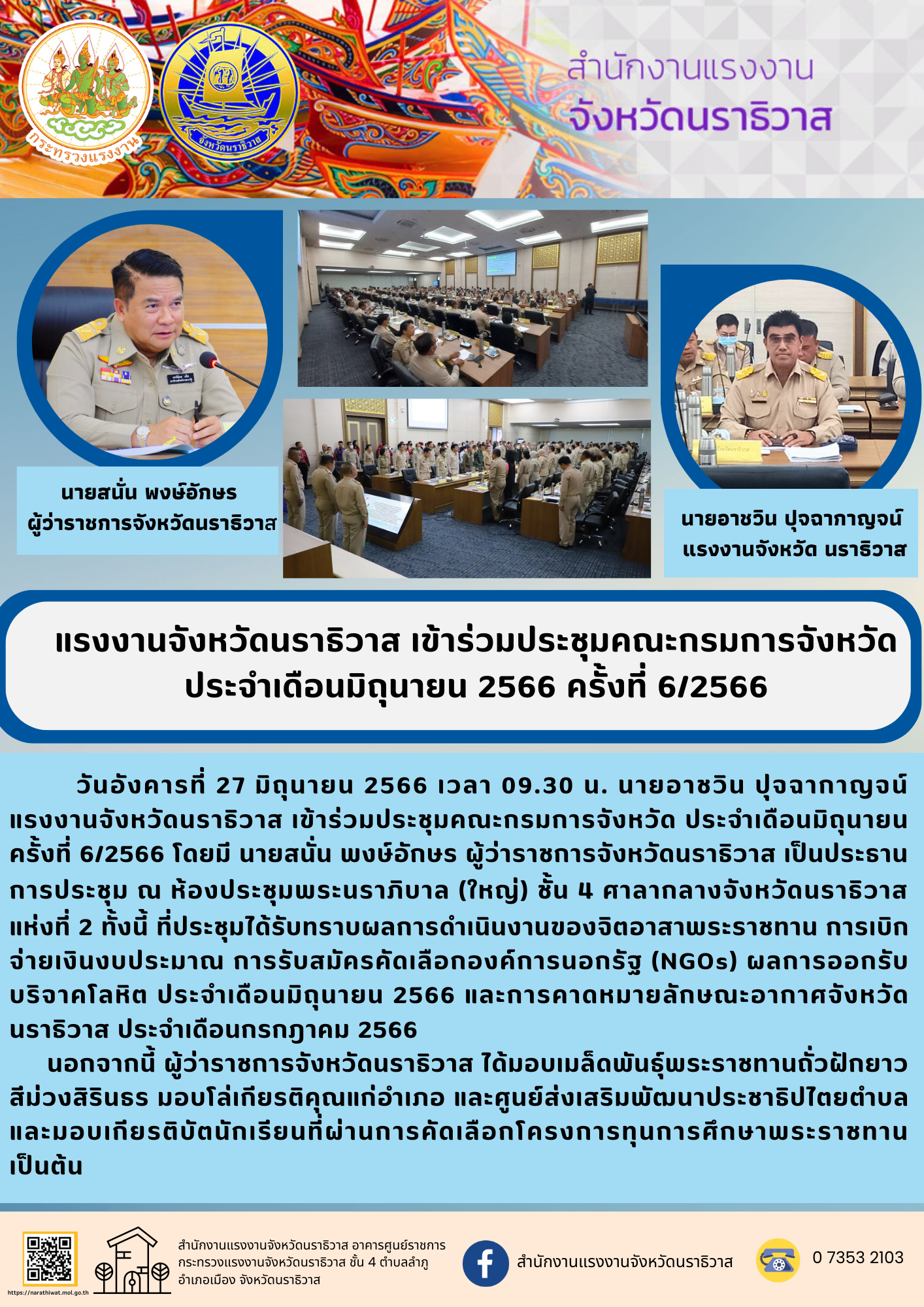 วันอังคารที่ 27 มิถุนายน 2566 เวลา 09.30 น. นายอาชวิน ปุจฉากาญจน์ แรงงานจังหวัดนราธิวาส เข้าร่วมประชุมคณะกรมการจังหวัด ประจำเดือนมิถุนายน ครั้งที่ 6/2566 โดยมี นายสนั่น พงษ์อักษร ผู้ว่าราชการจังหวัดนราธิวาส เป็นประธานการประชุม ณ ห้องประชุมพระนราภิบาล (ใหญ่) ชั้น 4 ศาลากลางจังหวัดนราธิวาส แห่งที่ 2 ทั้งนี้ ที่ประชุมได้รับทราบผลการดำเนินงานของจิตอาสาพระราชทาน การเบิกจ่ายเงินงบประมาณ การรับสมัครคัดเลือกองค์การนอกรัฐ (NGOs) ผลการออกรับบริจาคโลหิต ประจำเดือนมิถุนายน 2566 และการคาดหมายลักษณะอากาศจังหวัดนราธิวาส ประจำเดือนกรกฎาคม 2566 นอกจากนี้ ผู้ว่าราชการจังหวัดนราธิวาส ได้มอบเมล็ดพันธุ์พระราชทานถั่วฝักยาวสีม่วงสิรินธร มอบโล่เกียรติคุณแก่อำเภอ และศูนย์ส่งเสริมพัฒนาประชาธิปไตยตำบลและมอบเกียรติบัตนักเรียนที่ผ่านการคัดเลือกโครงการทุนการศึกษาพระราชทาน เป็นต้น
