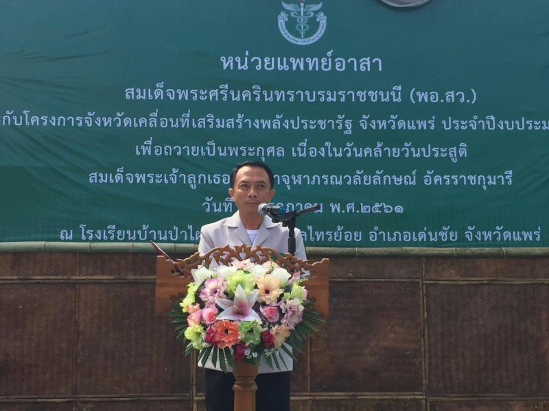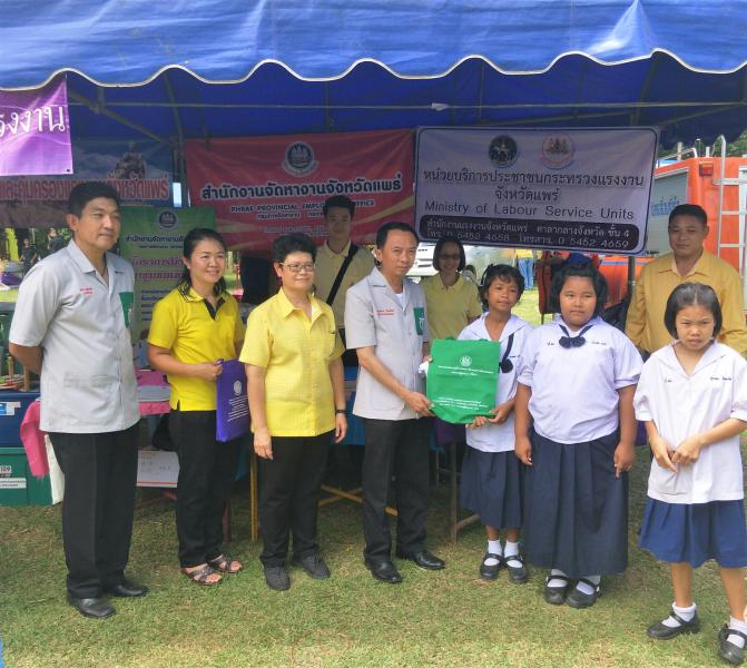 วันนี้ (4 กรกฎาคม 2561) เวลา 09.00 น. นางสาวปราณี ชลารักษ์ แรงงานจังหวัดแพร่ ได้มอบหมายให้นางสาวกัลยา จงถาวรกุล เจ้าพนักงานการเงินและบัญชีชำนาญงาน ข้าราชการสำนักงานแรงงานจังหวัดแพร่ เข้าร่วมโครงการจังหวัดเคลื่อนที่เสริมสร้างประชารัฐ จังหวัดแพร่ ประจำปีงบประมาณ 2561 ณ โรงเรียนบ้านป่าไผ่ หมู่ที่ 5 บ้านป่าไผ่ ตำบลไทรย้อย อำภอเด่นชัย จังหวัดแพร่ โดยมีนายพงศ์รัตน์ ภิรมย์รัตน์ ผู้ว่าราชการจังหวัดแพร่ เป็นประธานในพิธีดังกล่าว