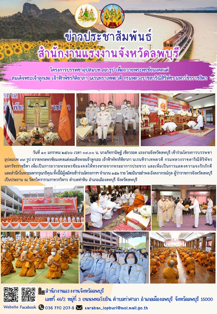 วันที่ 10 มกราคม 2566 เวลา 09.00 น. นางภัทรานิษฐ์ เขียวรอด แรงงานจังหวัดลพบุรี เข้าร่วมโครงการบรรพชาอุปสมบท 99 รูป ถวายพระพรชัยมงคลแด่สมเด็จพระเจ้าลูกเธอ เจ้าฟ้าพัชรกิติยาภา นเรนทิราเทพยวดี กรมหลวงราชสาริณีสิริพัชร มหาวัชรราชธิดา เพื่อเป็นการถวายพระพรชัยมงคลให้ทรงหายจากพระอาการประชวร และเพื่อเป็นการแสดงความจงรักภักดี และสำนึกในพระมหากรุณาธิคุณ ทั้งนี้มีผู้สมัครเข้าร่วมโครงการฯ จำนวน 151 ราย โดยมีนายอำพล อังคภากรณ์กุล ผู้ว่าราชการจังหวัดลพบุรีเป็นประธาน ณ วัดกวิศรารามราชวรวิหาร ตำบลท่าหิน อำเภอเมืองลพบุรี จังหวัดลพบุรี