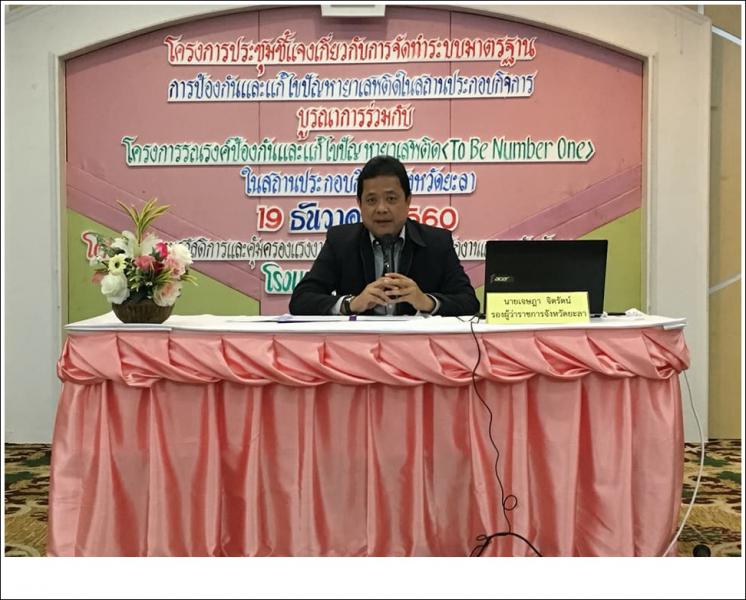เมื่อวันที่ 19 ธันวาคม 2560 สำนักงานแรงงานจังหวัดยะลา ร่วมกับสำนักงานสวัสดิการและคุ้มครองแรงงานจังหวัดยะลา จัดโครงการประชุมชี้แจงเกี่ยวกับการจัดทำระบบมาตรฐานการป้องกันและแก้ไขปัญหายาเสพติดในสถานประกอบกิจการ บูรณาการร่วมกับ โครงการรณรงค์ป้องกันและแก้ไขปัญหายาเสพติด (TO BE NUMBER ONE) ณ ห้องขวัญจุฑา โรงแรมปาร์ควิว โดยมี ท่านเจษฎา จิตรัตน์ รองผู้ว่าราชการจังหวัดยะลาเป็นประธานพิธีเปิดฯ