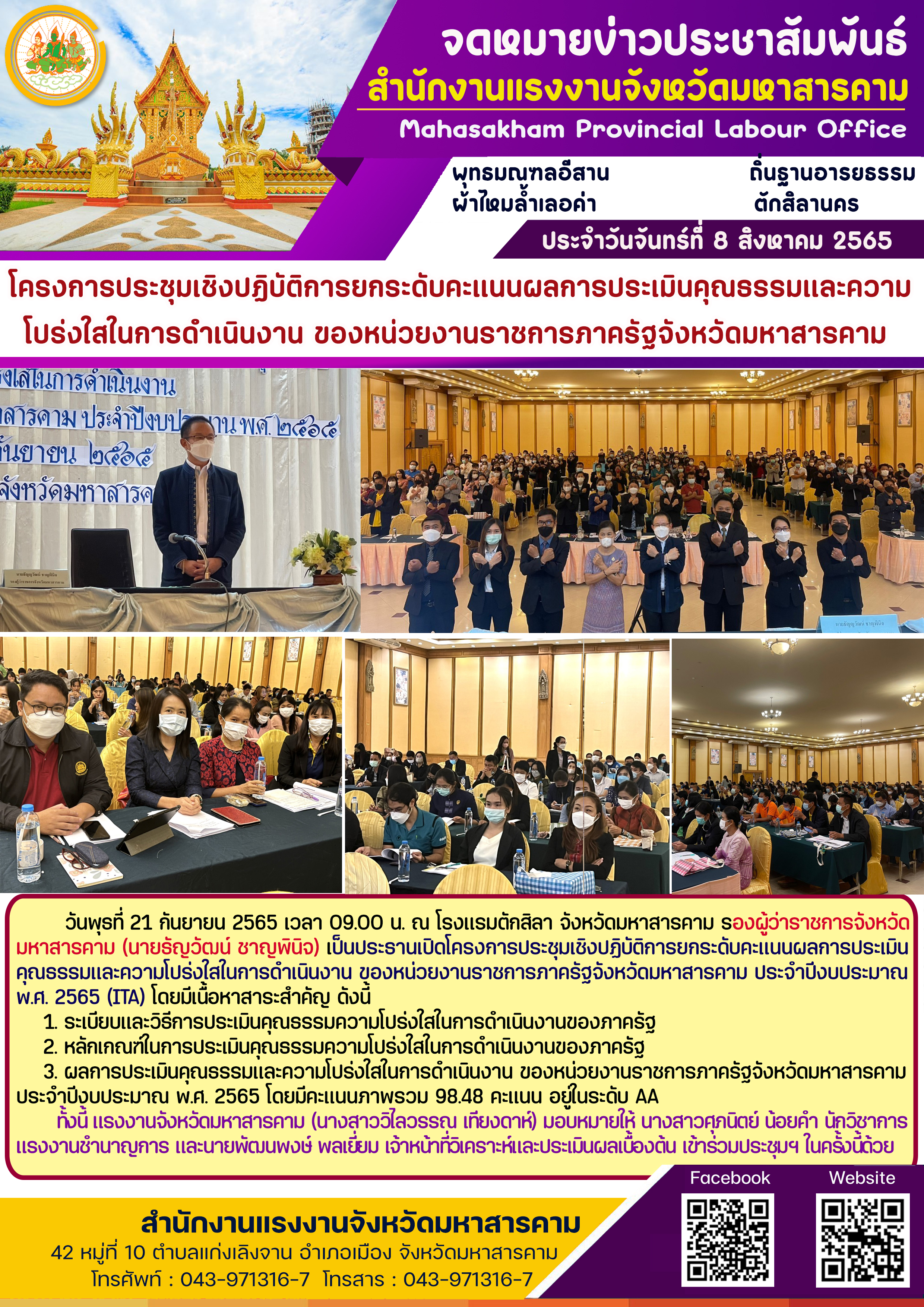 วันพุธที่ 21 กันยายน 2565 เวลา 09.00 น. ณ โรงแรมตักสิลา จังหวัดมหาสารคาม รองผู้ว่าราชการจังหวัดมหาสารคาม (นายธัญวัฒน์ ชาญพินิจ) เป็นประธานเปิดโครงการประชุมเชิงปฏิบัติการยกระดับคะแนนผลการประเมินคุณธรรมและความโปร่งใสในการดำเนินงาน ของหน่วยงานราชการภาครัฐจังหวัดมหาสารคาม ประจำปีงบประมาณ พ.ศ. 2565 (ITA) โดยมีเนื้อหาสาระสำคัญ ดังนี้