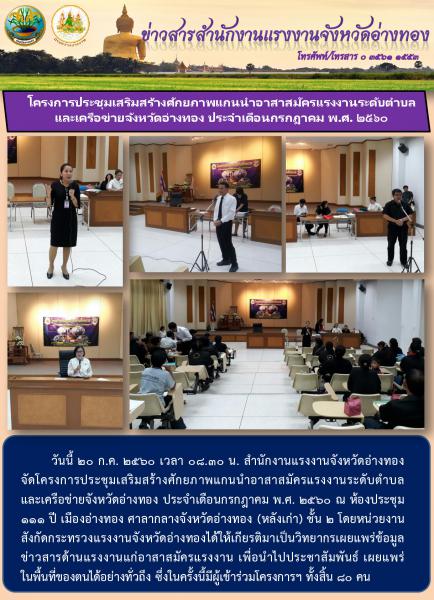 โครงการประชุมเสริมสร้างศักยภาพแกนนำอาสาสมัครแรงงานระดับตำบล และเครือข่ายจังหวัดอ่างทอง ประจำเดือนกรกฎาคม พ.ศ. ๒๕๖๐