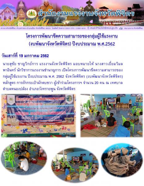 นายสุชัย ชาญวิกย์การ แรงงานจังหวัดพิจิตร พร้อมด้วยเจ้าหน้าที่ผู้รับผิดชอบโครงการเปิดโครงการพัฒนาขีดความสามารถของกลุ่มผู้ใช้แรงงาน ปีงบประมาณ พ.ศ. 2562 จังหวัดพิจิตร (งบพัฒนาจังหวัดพิจิตร) หลักสูตร
