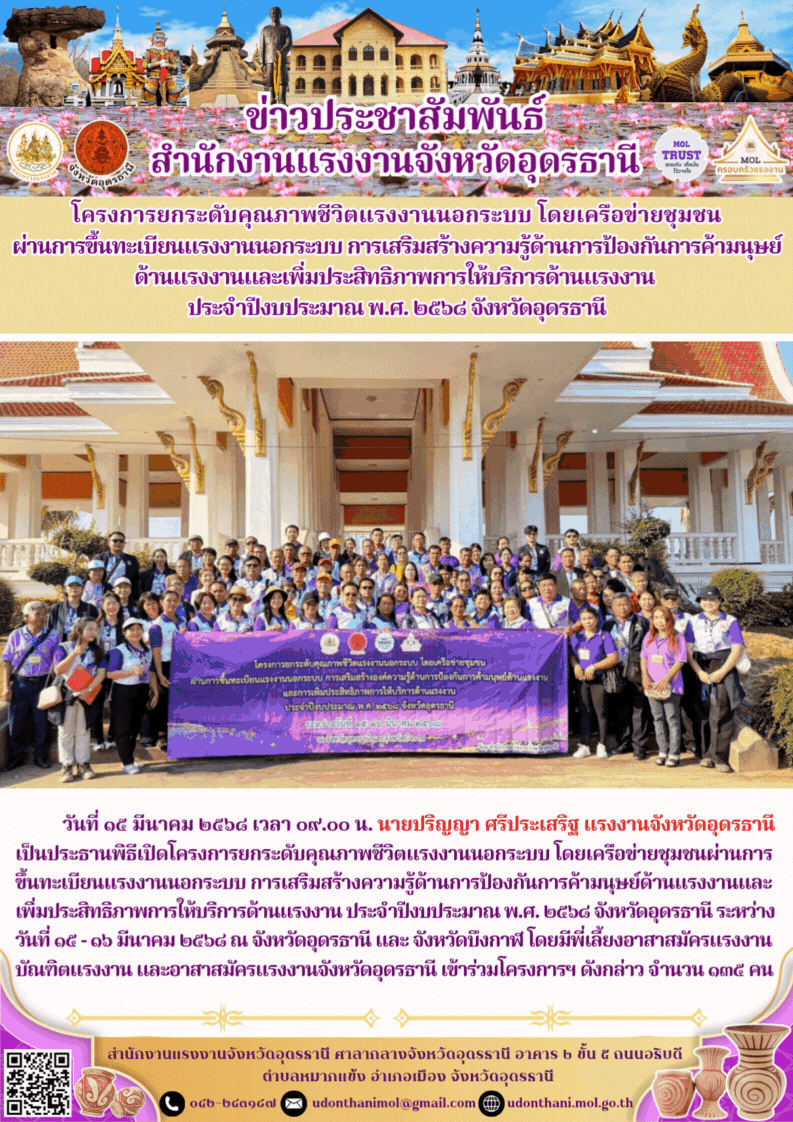 โครงการยกระดับคุณภาพชีวิตแรงงานนอกระบบโดยเครือข่ายชุมชนผ่านการขึ้นทะเบียนแรงงานนอกระบบการเสริมสร้างความรู้ด้านการป้องกันการค้ามนุษย์ด้านแรงงานและเพิ่มประสิทธิภาพการให้บริการด้านแรงงาน ประจำปีงบประมาณ พ.ศ. ๒๕๖๘ จังหวัดอุดรธานี