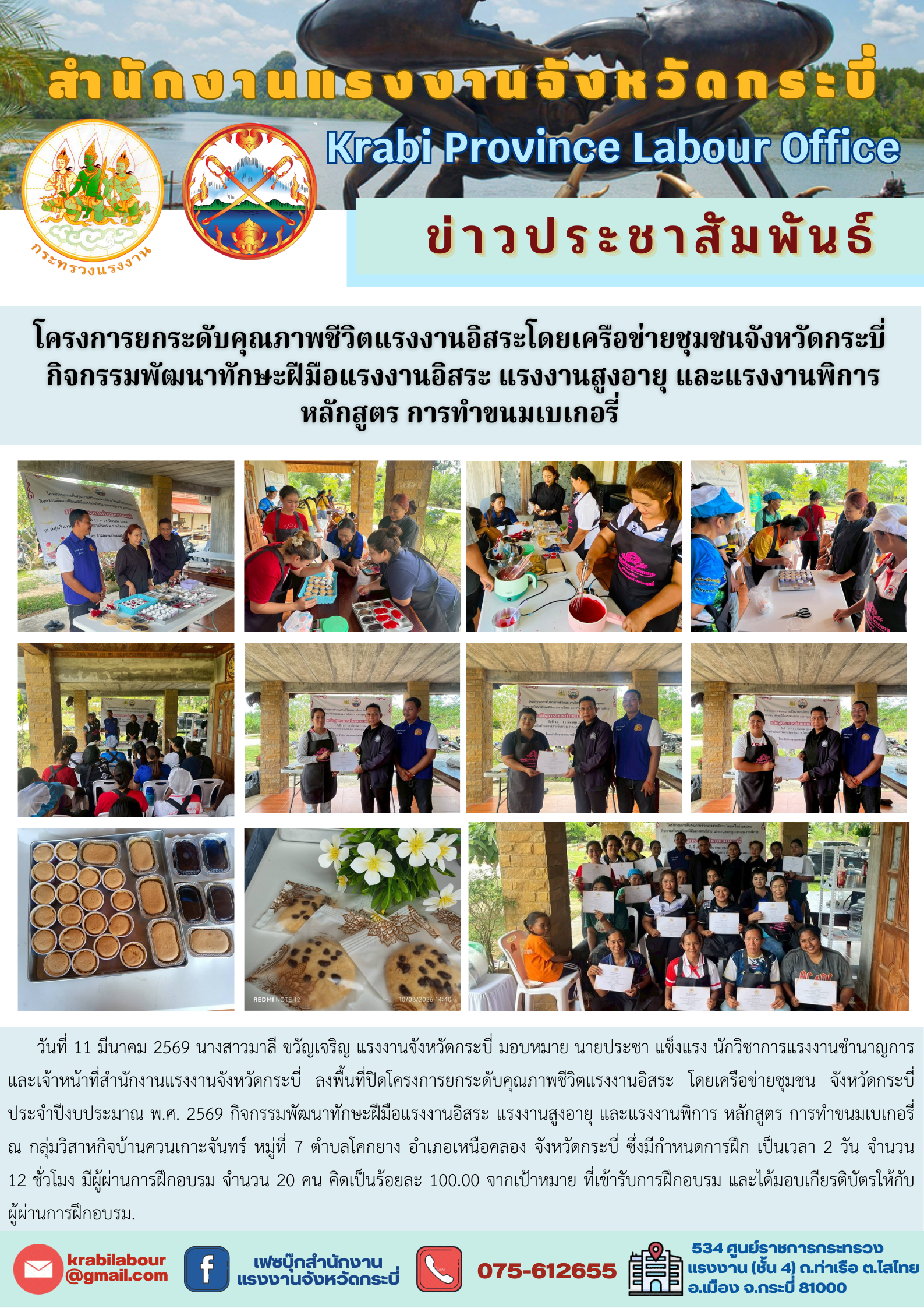 โครงการยกระดับคุณภาพชีวิตแรงงานอิสระโดยเครือข่ายชุมชนจังหวัดกระบี่ กิจกรรมพัฒนาทักษะฝีมือแรงงานอิสระ แรงงานสูงอายุ และแรงงานพิการ ปิดหลักสูตร การทำขนมเบเกอรี่
