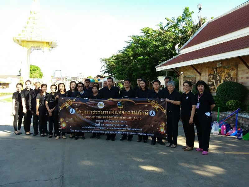 วันที่ 19 ตุลาคม 2560 เวลา 07.00 น. สำนักงานแรงงานจังหวัดหนองคาย โดยการนำของท่านวิชิตร สุวรรณมาก แรงงานจังหวัดหนองคาย ได้นำเจ้าหน้าที่หน่วยงานสังกัดกระทรวงแรงงานจังหวัดหนองคาย อาสาสมัครแรงงานจังหวัดหนองคาย พี่เลี้ยงอาสาสมัครแรงงาน และประชาชนผู้มีจิตอาสา เข้าร่วมโครงการรวมพลังแห่งความภักดี โดยอาสาสมัครแรงงานจังหวัดหนองคาย ประจำปีงบประมาณ พ.ศ. 2561 ณ วัดโพธิ์ชัยพระอารามหลวง อำเภอเมืองหนองคาย จังหวัดหนองคาย ประกอบด้วยกิจกรรมทำบุญตักบาตรและบำเพ็ญสาธารณะประโยชน์เพื่อถวายเป็นพระราชกุศลแด่พระบาทสมเด็จพระปรมินทรมหาภูมิพลอดุลยเดช มหิตลาธิเบศรรามาธิบดี จักรีนฤบดินทร สยามินทราธิราช บรมนาถบพิตร