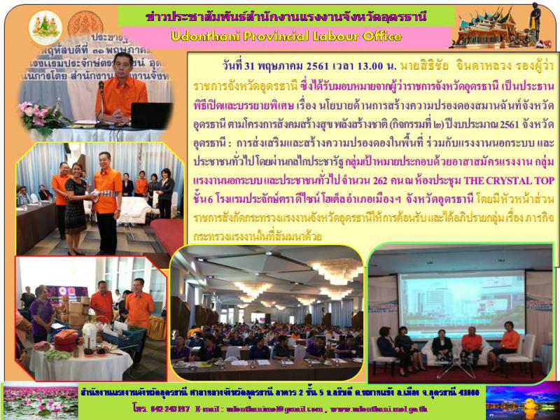 โครงการสังคมสร้างสุข พลังสร้างชาติ (กิจกรรมที่ 2) ปีงบประมาณ 2561 จังหวัดอุดรธานี : การส่งเสริมและสร้างการปรองดองในพื้นที่ร่วมกับแรงงานนอกระบบและประชาชนทั่วไปผ่านกลไกประชารัฐ