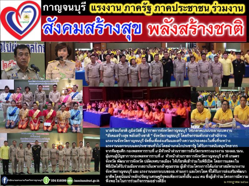 นายจีระเกียรติ ภูมิสวัสดิ์ ผู้ว่าราชการจังหวัดกาญจนบุรี ให้เกียรติเป็นประธานในพิธีเปิดงาน "สังคมสร้างสุข พลังสร้างชาติ" จังหวัดกาญจนบุรี โดยกิจกรรมดังกล่าวสำนักงานแรงงานจังหวัดกาญจนบุรี จัดขึ้นเพื่อส่งเสริมและสร้างความปรองดองในพื้นที่ระหว่างแรงงานนอกระบบและประชาชนทั่วไปโดยผ่านกลไกประชารัฐ ได้รับการสนับสนุนวิทยากรจากทีมขุนศึก กองพลทหารราบที่ 9 มีหัวหน้าส่วนราชการสังกัดกระทรวงแรงงาน รองผอ.รม ผู้แทนผู้บัญชาการกองพลทหารราบที่ 9 หัวหน้าส่วนราชการจังหวัดกาญจนบุรี อาทิ เกษตรจังหวัด พัฒนาการจังหวัด ปลัดเทศบาลเมือง ให้เกียรติเข้าร่วมพิธีเปิด โดยการแสดงในพิธีเปิดได้รับร่วมมือจากสถาบันเพาะกล้าคุณธรรม ผู้เข้าร่วมโครงการได้แก่อาสาสมัครแรงงานจังหวัดกาญจนบุรีและแรงงานนอกระบบของ อ.ท่ามะกา และไทรโยคที่ได้รับการส่งเสริมพัฒนาอาชีพโดยน้อมนำหลักปรัญชาเศรษฐกิจพอเพียงรวมทั้งสิ้น 188 คน ซึ่งผู้เข้าร่วมโครงการมีความพึงพอใจในการร่วมกิจกรรมอย่างดียิ่ง