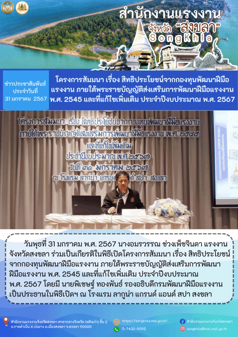 วันพุธที่ 31 มกราคม พ.ศ. 2567 นางอมรวรรณ ช่วงเพ็ชจินดา แรงงานจังหวัดสงขลา ร่วมเป็นเกียรติในพิธีเปิดโครงการสัมมนา เรื่อง สิทธิประโยชน์จากกองทุนพัฒนาฝีมือแรงงาน ภายใต้พระราชบัญญัติส่งเสริมการพัฒนาฝีมือแรงงาน พ.ศ. 2545 และที่แก้ไขเพิ่มเติม ประจำปีงบประมาณ พ.ศ. 2567 โดยมี นายพิเชษฐ์ ทองพันธ์ รองอธิบดีกรมพัฒนาฝีมือแรงงาน เป็นประธานในพิธีเปิดฯ ณ โรงแรม ลากูน่า แกรนด์ แอนด์ สปา สงขลา