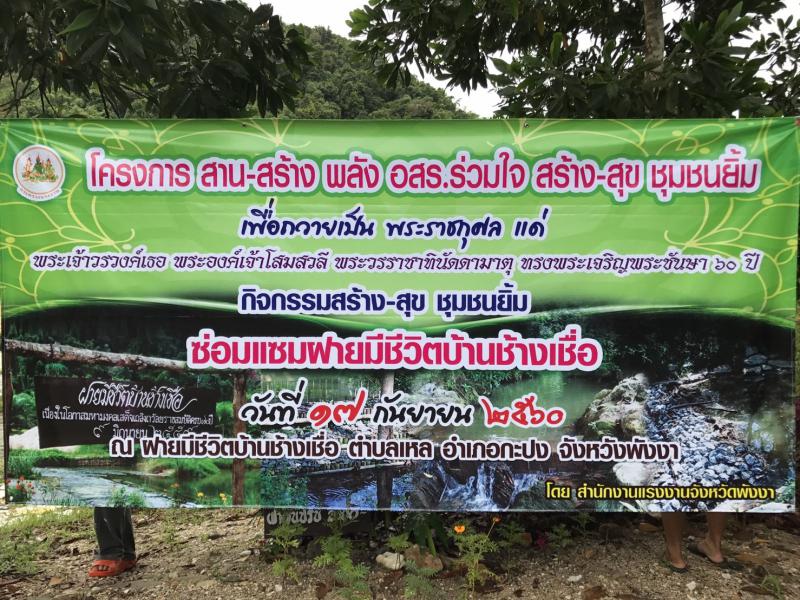สำนักงานแรงงานจังหวัดพังงา ร่วมกับอาสาสมัครแรงงานจัดฌครงการสาน – สร้าง พลังอสร. ร่วมใจสร้าง – สุข ชุมชนยิ้ม กิจกรรมซ่อมแซมฝายมีชีวิตบ้านช้างเชื่อ ต.เหล อ.กะปง จ.พังงา ถวายเป็นพระราชกุศลแด่พระเจ้าวรวงค์เธอ พระองค์เจ้าโสมสวลี พระวรราชาทินัดดามาตุ ทรงพระเจริญพระชันษา 60 ปี โดยมีข้าราชการ เจ้าหน้าที่ในหน่วยงานสังกัดกระทรวงแรงงาน อาสาสมัครแรงงาน นายอำเภอกะปง กำนัน ต.เหล และประชาชนบ้านช้างเชื่อ เข้าร่วมกิจกรรมในลักษณะบูรณาการร่วมมือ ร่วมแรง ร่วมใจสร้างประโยชน์ สร้างสุขให้ชุมชนยิ้มได้ ไม่น้อยกว่า 200 คน