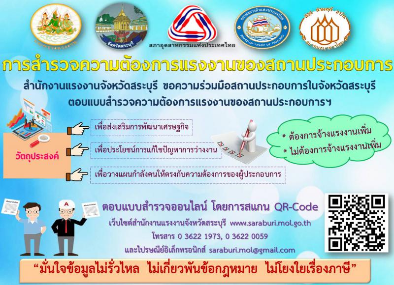 จังหวัดสระบุรี จึงขอความร่วมมือท่านตอบแบบสำรวจข้อมูลความต้องการแรงงานของสถานประกอบการ ปี 2561 รายละเอียดตามสิ่งที่ส่งมาด้วย โดยตอบกลับแบบสำรวจข้อมูลความต้องการแรงงานฯ ได้ที่สำนักงานแรงงานจังหวัดสระบุรี ชั้น 1 ศาลากลางจังหวัดสระบุรี ถนนพิชัยรณรงค์สงคราม ตำบลปากเพรียว อำเภอเมือง จังหวัดสระบุรี 18000 ทางโทรสาร 0 3622 1973 หรือทาง E-mail: saraburi.mol@gmail.com,saraburi_labor@hotmail.com ภายในวันที่ 16 กรกฎาคม 2561
