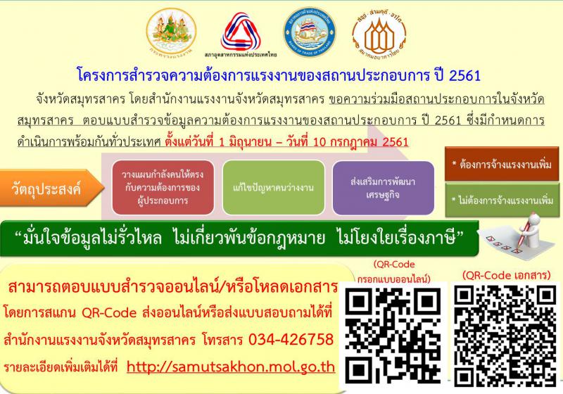 จังหวัดสมุทรสาคร จึงขอความร่วมมือท่านตอบแบบสำรวจข้อมูลความต้องการแรงงานของสถานประกอบการ ปี 2561 รายละเอียดตามสิ่งที่ส่งมาด้วย โดยตอบกลับแบบสำรวจข้อมูลความต้องการแรงงานฯ ได้ที่สำนักงานแรงงานจังหวัดสมุทรสาคร ชั้น 2 ศาลากลางจังหวัด ตำบลมหาชัย อำเภอเมืองสมุทรสาคร จังหวัดสมุทรสาคร 74000 ทางโทรสาร ๐๓๔-๔๒๖-๗๕๘ หรือทาง E-mail : molsamutsa@gmail.com,sakda.mol@hotmail.com ภายในวันที่ 10 กรกฎาคม 2561