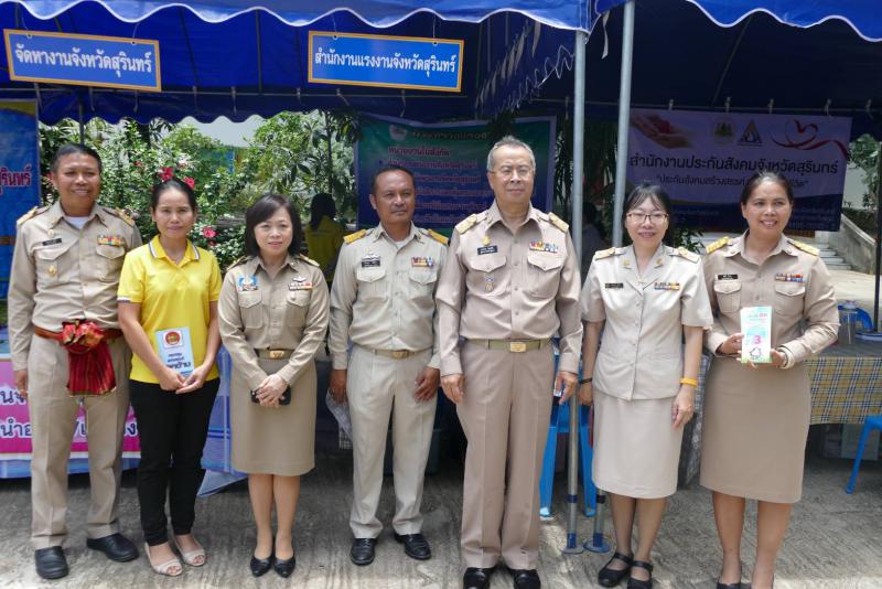 วันที่ ๒๓ กรกฎาคม ๒๕๖๑ ๒๕๖๑ เวลา ๐๙.๓๐ สำนักงานแรงงานจังหวัดสุรินทร์ พร้อมด้วยหน่วยงานสังกัดกระทรวงแรงงานจังหวัดสุรินทร์ ร่วมออกหน่วยบริการโครงการสุรินทร์สร้างสุข สร้างรอยยิ้ม และโครงการบ้านธารน้ำใจสร้างสุข สร้างรอยยิ้ม ประจำปีงบประมาณ ๒๕๖๑ ในเขตพื้นที่อำเภอท่าตูม ณ วัดจำปาทอง ตำบลหนองบัว อำเภอท่าตูม จังหวัดสุรินทร์ ให้บริการด้านการสาธิตการพับเหรียญโปรยทาน /การรับสมัครงาน/ให้คำปรึกษาปัญหาด้านแรงงานและการประกันสังคม/รับสมัครฝึกอาชีพ/ เป็นต้น โดยมีนายอรรถพร สิงหวิชัย ผู้ว่าราชการจังหวัดสุรินทร์ เป็นประธาน