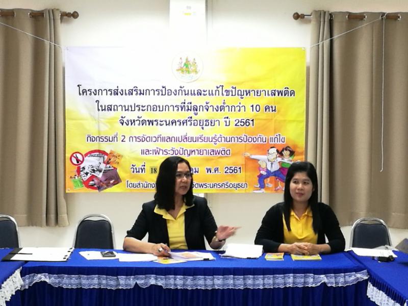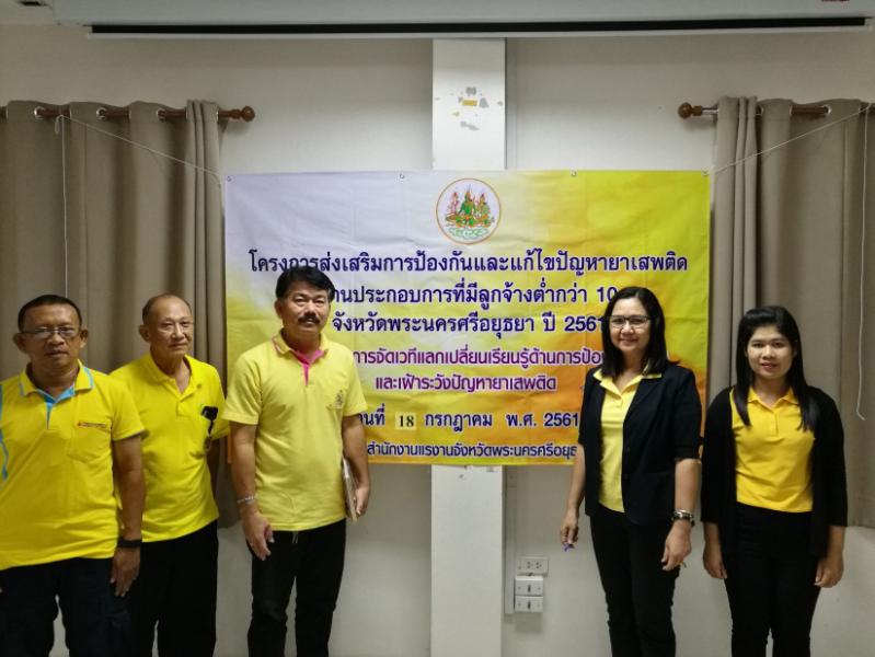 วันที่ 18 กรกฎาคม 2561 สำนักงานแรงงานจังหวัดพระนครศรีอยุธยา ได้ดำเนินการจัดประชุมโครงการส่งเสริมการป้องกันและแก้ไขปัญหายาเสพติด ในสถานประกอบการที่มีลูกจ้างต่ำกว่า 10 คน จังหวัดพระนครศรีอยุธยา ปี 2561 กิจกรรมที่ 2 การจัดเวทีแลกเปลี่ยนเรียนรู้ด้านการป้องกัน แก้ไข และเฝ้าระวังปัญหา ยาเสพติด ณ เทศบาลตำบลโรงช้าง อำเภอมหาราช จังหวัดพระนครศรีอยุธยา