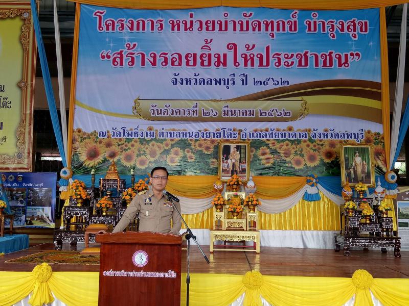 วันอังคารที่ 26 มีนาคม 2562 : 08.00 น. นางสาวปาริชาติ สวนใจ แรงงานจังหวัดอุตรดิตถ์ รักษาราชการแทน แรงงานจังหวัดลพบุรี ร่วมโครงการ “หน่วยบำบัดทุกข์ บำรุงสุข สร้างรอยยิ้มให้ประชาชน จังหวัดลพบุรี ปี 2562” ณ วัดโพธิ์งาม ตำบลหนองยายโต๊ะ อำเภอชัยบาดาล จังหวัดลพบุรี โดยมี นายสุปกิต โพธิ์ปภาพันธ์ ผู้ว่าราชการจังหวัดลพบุรี เป็นประธานในงาน เพื่อนำบริการต่างๆ ของหน่วยงานสังกัดกระทรวงแรงงานจังหวัดลพบุรี บริการประชาชนในพื้นที่