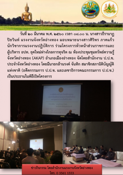 โครงการหัวหน้าส่วนราชการและผู้บริหาร อปท. ยุคใหม่ห่างไกลการทุจริต จัดโดยสำนักงาน ป.ป.ช. ประจำจังหวัดอ่างทอง