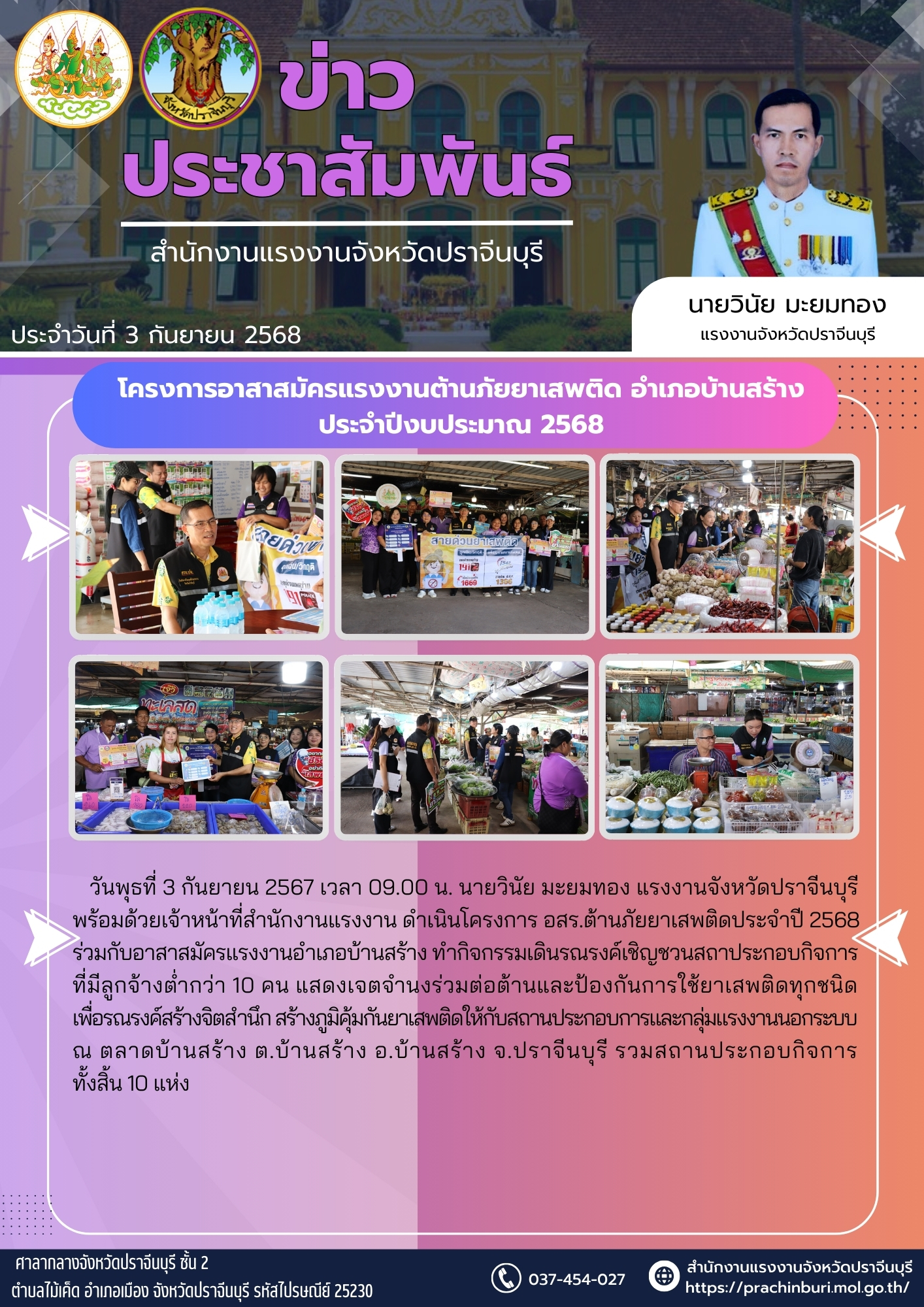 วันพุธที่ 3 กันยายน 2567 เวลา 09.00 น. นายวินัย มะยมทอง แรงงานจังหวัดปราจีนบุรี พร้อมด้วยเจ้าหน้าที่สำนักงานแรงงาน ดำเนินโครงการ อสร.ต้านภัยยาเสพติดประจำปี 2568 ร่วมกับอาสาสมัครแรงงานอำเภอบ้านสร้าง ทำกิจกรรมเดินรณรงค์เชิญชวนสถาประกอบกิจการ ที่มีลูกจ้างต่ำกว่า 10 คน แสดงเจตจำนงร่วมต่อต้านและป้องกันการใช้ยาเสพติดทุกชนิด เพื่อรณรงค์สร้างจิตสำนึก สร้างภูมิคุ้มกันยาเสพติดให้กับสถานประกอบการและกลุ่มแรงงานนอกระบบ ณ ตลาดบ้านสร้าง ต.บ้านสร้าง อ.บ้านสร้าง จ.ปราจีนบุรี รวมสถานประกอบกิจการ ทั้งสิ้น 10 แห่ง