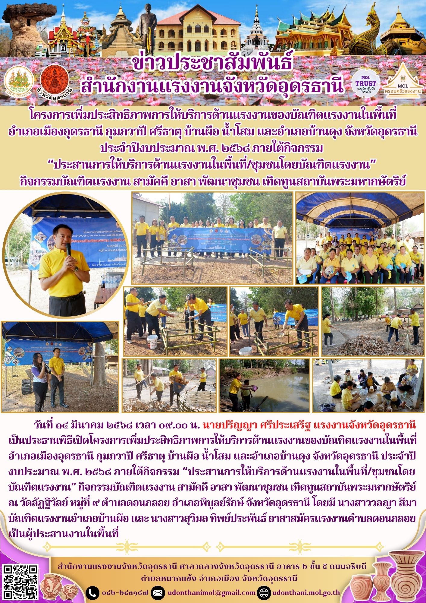 โครงการเพิ่มประสิทธิภาพการให้บริการด้านแรงงานของบัณฑิตแรงงานในพื้นที่ อำเภอเมืองอุดรธานี กุมภวาปี ศรีธาตุ บ้านผือ น้ำโสม และอำเภอบ้านดุง จังหวัดอุดรธานี ประจำปีงบประมาณ พ.ศ. ๒๕๖๘ ภายใต้กิจกรรม “ประสานการให้บริการด้านแรงงานในพื้นที่/ชุมชนโดยบัณฑิตแรงงาน” กิจกรรมบัณฑิตแรงงาน สามัคคี อาสา พัฒนาชุมชน เทิดทูนสถาบันพระมหากษัตริย์