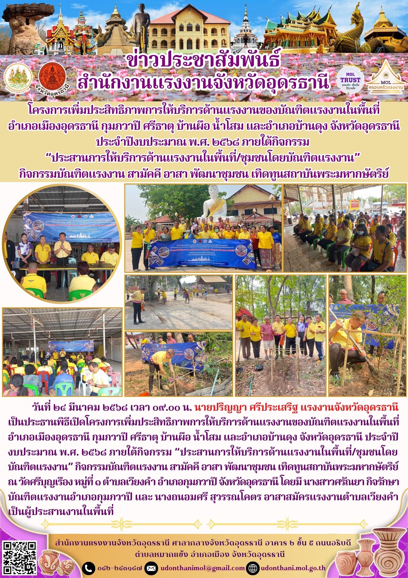 โครงการเพิ่มประสิทธิภาพการให้บริการด้านแรงงานของบัณฑิตแรงงานในพื้นที่ อำเภอเมืองอุดรธานี กุมภวาปี ศรีธาตุ บ้านผือ น้ำโสม และอำเภอบ้านดุง จังหวัดอุดรธานี ประจำปีงบประมาณ พ.ศ. ๒๕๖๘ ภายใต้กิจกรรม “ประสานการให้บริการด้านแรงงานในพื้นที่/ชุมชนโดยบัณฑิตแรงงาน” กิจกรรมบัณฑิตแรงงาน สามัคคี อาสา พัฒนาชุมชน เทิดทูนสถาบันพระมหากษัตริย์