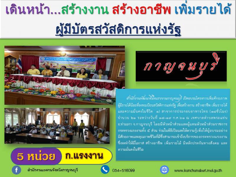 สำนักงานพัฒนาฝีมือแรงงานกาญจนบุรี เปิดอบรมโครงการเพิ่มศักยภาพผู้มีรายได้น้อยที่ลงทะเบียนสวัสดิการแห่งรัฐ เพื่อสร้างงาน สร้างอาชีพ เพิ่มรายได้ และความมั่นคงในชีวิต 1) สาขาการประกอบอาหารไทย (18ชั่วโมง) จำนวน 21 คนระหว่างวันที่ 17–19 ก.ค.61 ณ เทศบาลตำบลพระแท่น อ.ท่ามะกา จ.กาญจนบุรี โดยมีหัวหน้าส่วนและผู้แทนหัวหน้าส่วนราชการกระทรวงแรงงานทั้ง 5 ส่วน ร่วมในพิธีเปิดและให้ความรู้เพื่อให้ผู้อบรมอย่างมีศักยภาพและคุณภาพชีวิตที่ดีซึ่งสามารถเข้าถึงบริการของกระทรวงแรงงานซึ่งจะทำให้มีโอกาส สร้างอาชีพ เพิ่มรายได้ มีหลักประกันทางสังคม และความมั่นคงในชีวิต