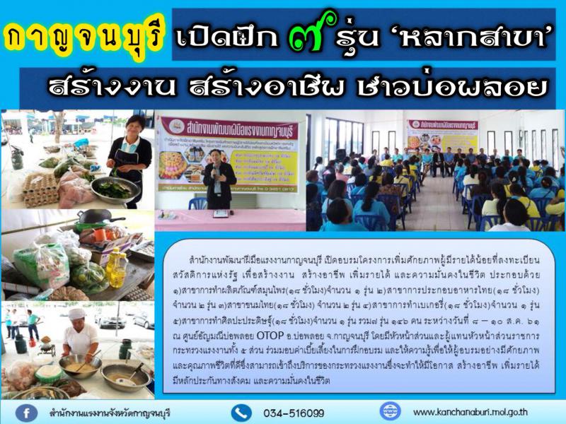 ประกอบด้วย ๑) สาขาการทำผลิตภัณฑ์สมุนไพร(๑๘ ชั่วโมง)จำนวน ๑ รุ่น ๒)สาขาการประกอบอาหารไทย(๑๘ ชั่วโมง)จำนวน ๒ รุ่น ๓)สาขาขนมไทย(๑๘ ชั่วโมง) จำนวน ๒ รุ่น ๔)สาขาการทำเบเกอรี่(๑๘ ชั่วโมง)จำนวน ๑ รุ่น ๕)สาขาการทำศิลปะประดิษฐุ์(๑๘ ชั่วโมง)จำนวน ๑ รุ่น รวม๗ รุ่น ๑๔๖ คน ระหว่างวันที่ ๘ – ๑๐ ส.ค. ๖๑ ณ ศูนย์อัญมณีบ่อพลอย OTOP อ.บ่อพลอย จ.กาญจนบุรี