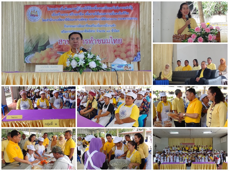 วันที่ 17 กรกฎาคม 2561 เวลา 13.30 น. นายวันชัย จันทร์พร รองผู้ว่าราชการจังหวัดพัทลุง เป็นประธานเปิดโครงการเพิ่มศักยภาพผู้มีรายได้น้อยที่ลงทะเบียนสวัสดิการแห่งรัฐ “เพื่อสร้างงาน สร้างอาชีพ เพิ่มรายได้ และความมั่นคงในชีวิต” ของกระทรวงแรงงาน กิจกรรมส่งเสริมและฝึกอาชีพเสริมเพื่อการมีงานทำหรือประกอบอาชีพอิสระ หลักสูตรการทำ-ขนมไทย จำนวน 4 รุ่น ระหว่างวันที่ 17 – 19 กรกฎาคม 2561 ณ ศาลาประชาคมอำเภอเขาชัยสน จังหวัดพัทลุง โดยนางอมรวรรณ ช่วงเพ็ชจินดา แรงงานจังหวัดพัทลุง พร้อมด้วย หัวหน้าส่วนราชการสังกัดกระทรวงแรงงาน นายกเทศมนตรี ปลัดอาวุโส อำเภอเขาชัยสนร่วมพิธีเปิดโครงการฯ โดยพร้อมเพรียงกัน
