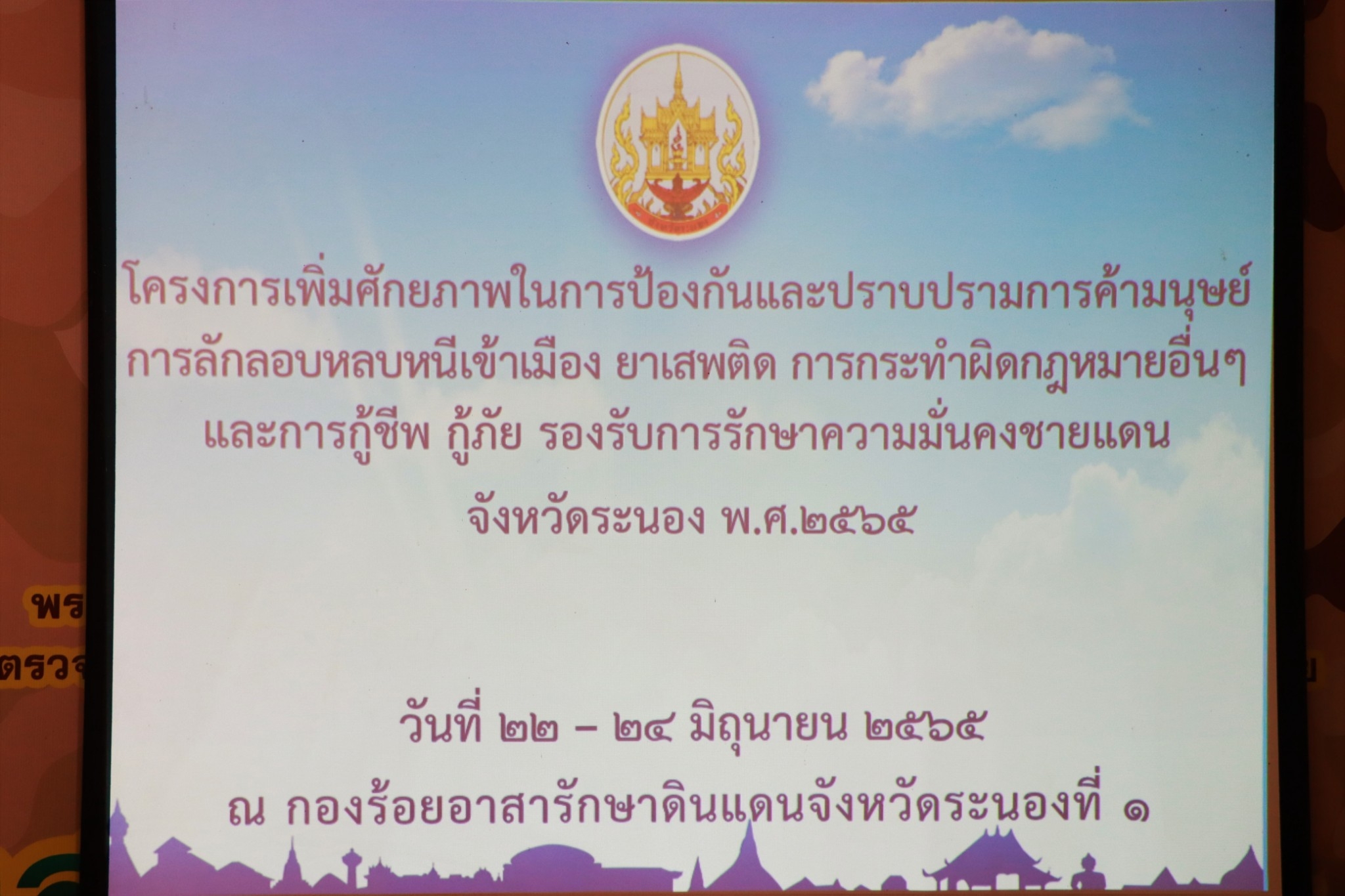 โครงการเพิ่มศักยภาพในการป้องกันและปราบปรามการค้ามนุษย์ การลักลอบหลบหนีเข้าเมือง ยาเสพติด การกระทำผิดกฏหมายอื่นๆ และการกู้ชีพ กู้ภัย รองรับการรักษาความมั่นคงชายแดนจังหวัดระนอง พ.ศ. 2565