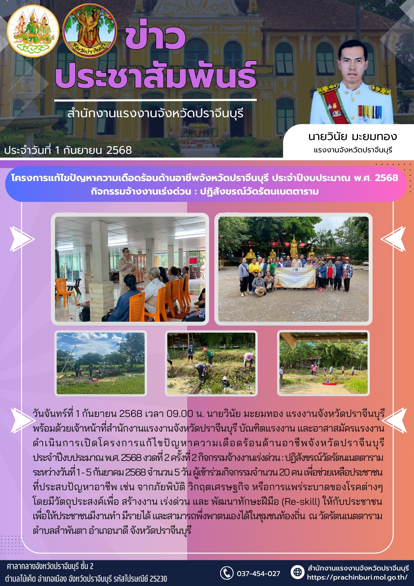 วันจันทร์ที่ 1 กันยายน 2568 เวลา 09.00 น. นายวินัย มะยมทอง แรงงานจังหวัดปราจีนบุรี พร้อมด้วยเจ้าหน้าที่สำนักงานแรงงานจังหวัดปราจีนบุรี บัณฑิตแรงงาน และอาสาสมัครแรงงานดำเนินการเปิดโครงการแก้ไขปัญหาความเดือดร้อนด้านอาชีพจังหวัดปราจีนบุรี ประจำปีงบประมาณ พ.ศ. 2568 งวดที่ 2 ครั้งที่ 2 กิจกรรมจ้างงานเร่งด่วน : ปฏิสังขรณ์วัดรัตนเนตตาราม ระหว่างวันที่ 1 – 5 กันยาคม 2568 จำนวน 5 วัน ผู้เข้าร่วมกิจกรรมจำนวน 20 คน เพื่อช่วยเหลือประชาชนที่ประสบปัญหาอาชีพ เช่น จากภัยพิบัติ วิกฤตเศรษฐกิจ หรือการแพร่ระบาดของโรคต่างๆ โดยมีวัตถุประสงค์เพื่อ สร้างงาน เร่งด่วน และ พัฒนาทักษะฝีมือ (Re-skill) ให้กับประชาชน เพื่อให้ประชาชนมีงานทำ มีรายได้ และสามารถพึ่งพาตนเองได้ในชุมชนท้องถิ่น ณ วัดรัตนเนตตาราม ตำบลสำพันตา อำเภอนาดี จังหวัดปราจีนบุรี