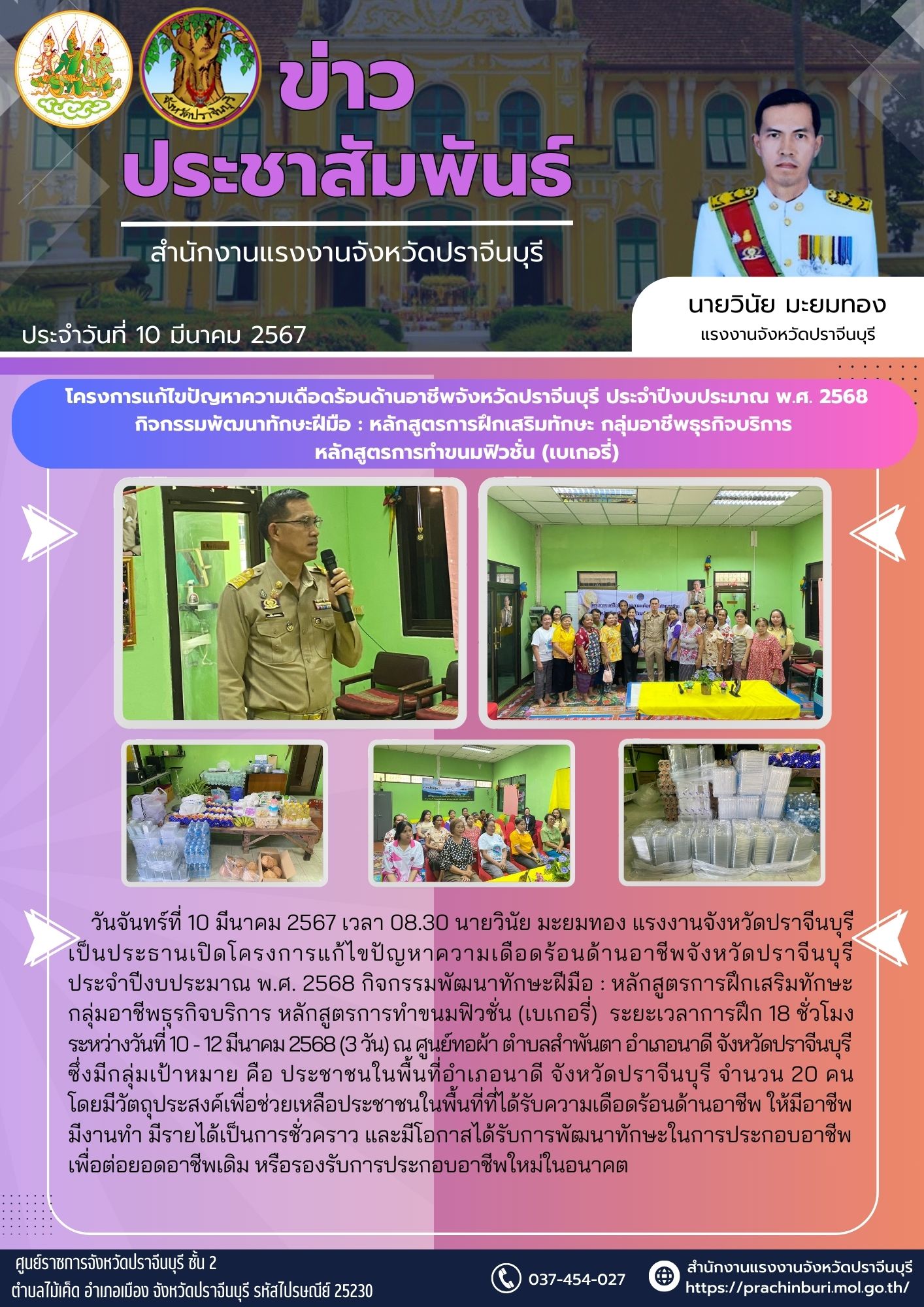 วันจันทร์ที่ 10 มีนาคม 2567 เวลา 08.30 นายวินัย มะยมทอง แรงงานจังหวัดปราจีนบุรี เป็นประธานเปิดโครงการแก้ไขปัญหาความเดือดร้อนด้านอาชีพจังหวัดปราจีนบุรี ประจำปีงบประมาณ พ.ศ. 2568 กิจกรรมพัฒนาทักษะฝีมือ : หลักสูตรการฝึกเสริมทักษะ กลุ่มอาชีพธุรกิจบริการ หลักสูตรการทำขนมฟิวชั่น (เบเกอรี่) ระยะเวลาการฝึก 18 ชั่วโมง ระหว่างวันที่ 10 – 12 มีนาคม 2568 (3 วัน) ณ ศูนย์ทอผ้า ตำบลสำพันตา อำเภอนาดี จังหวัดปราจีนบุรี ซึ่งมีกลุ่มเป้าหมาย คือ ประชาชนในพื้นที่อำเภอนาดี จังหวัดปราจีนบุรี จำนวน 20 คน โดยมีวัตถุประสงค์เพื่อช่วยเหลือประชาชนในพื้นที่ที่ได้รับความเดือดร้อนด้านอาชีพ ให้มีอาชีพ มีงานทำ มีรายได้เป็นการชั่วคราว และมีโอกาสได้รับการพัฒนาทักษะในการประกอบอาชีพ เพื่อต่อยอดอาชีพเดิม หรือรองรับการประกอบอาชีพใหม่ในอนาคต
